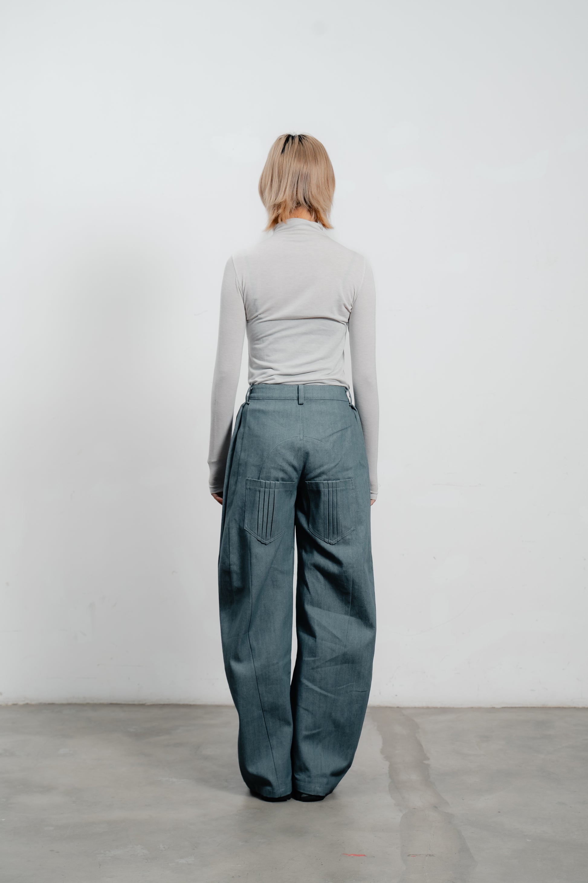 The leg width is highly exaggerated, flowing from the hip down into a tapered silhouette—one of the most effective contours for visual elongation. The multi-row button design cinches the abdomen and dramatically lifts the waistline, ensuring that despite the voluminous width of the leg, the body's proportions remain perfectly optimized. Moreover, the dimensional side pleats create a sculptural space within the trouser leg, allowing the garment to stand taut when still, yet imbued with a sense of fluid motion when walking. Notably, the back pocket features delicate accordion pleats—a refined craftsmanship that elevates this piece from a basic item to a sophisticated investment. This garment is designed for the wearer who possesses the confidence and sense of liberation to command an oversized silhouette.