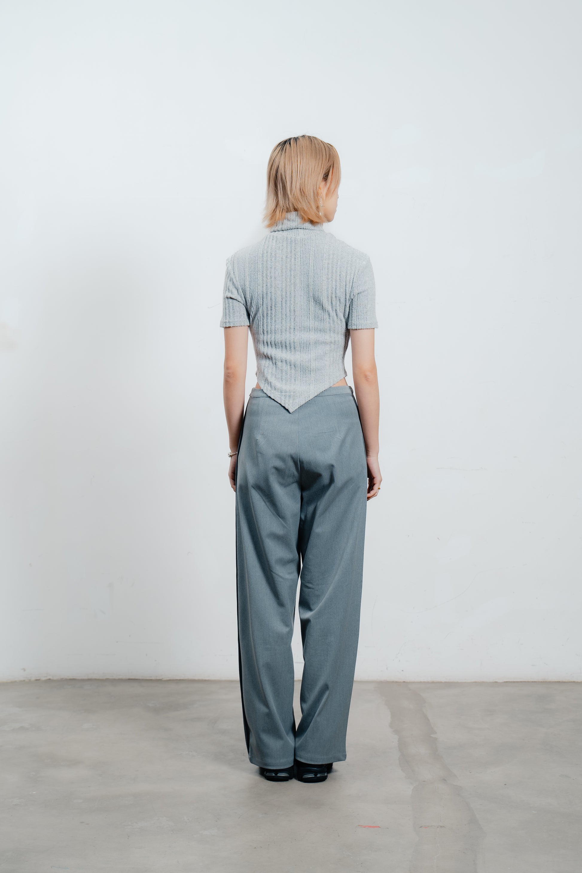 The trousers possess the crisp lines of tailored pants while retaining the comfort of casual wear. The inverted V-cut at the waist effectively locks in the waistline, visually maximizing the elongation of the legs. The fit is a straight-leg cut that is relaxed but not sloppy. It elegantly flatters the legs. It does not rely on ostentatious decoration but achieves true stylistic permanence through impeccable tailoring and tranquil coloring.