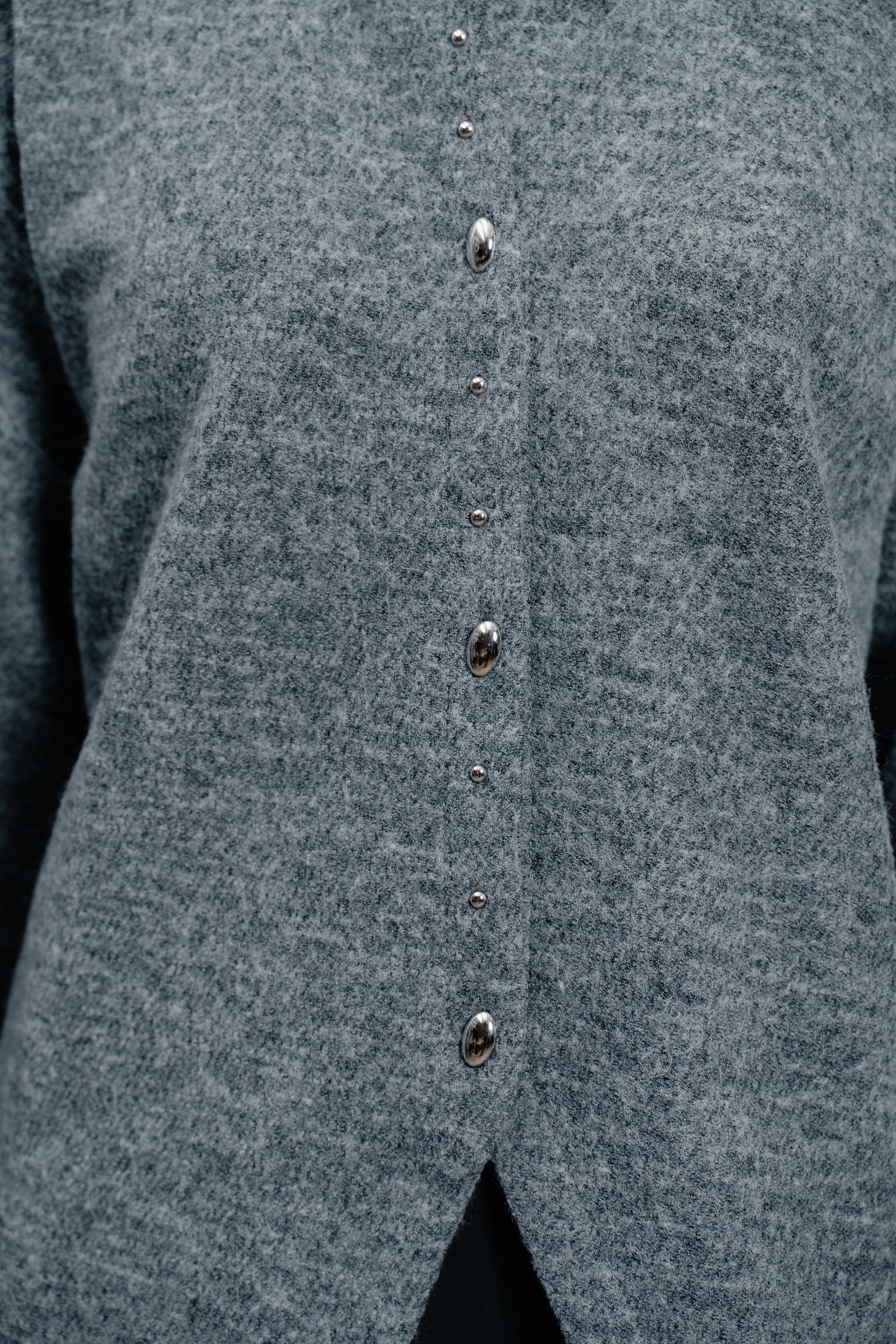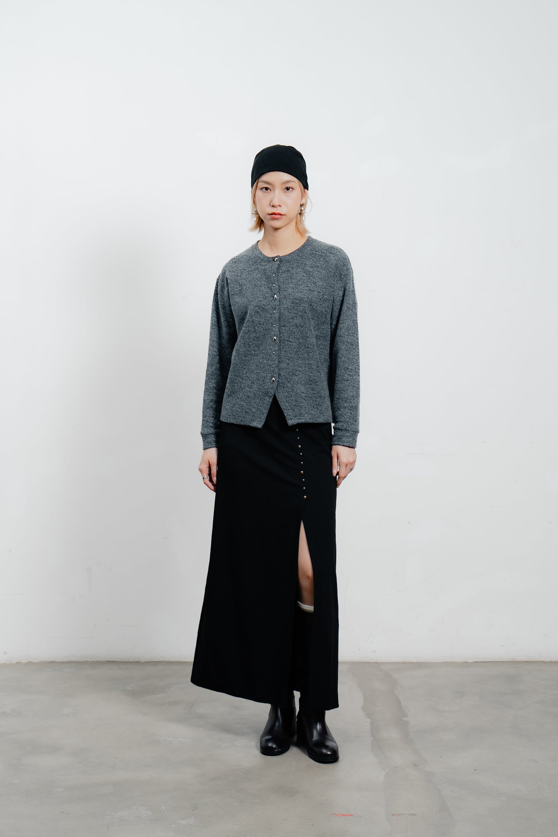 The core essence of this cardigan is "timelessness." It deliberately avoids any excessive design elements, focusing instead on delivering superior quality fabric, precise tailoring, and the most classic silhouette, allowing it to transcend seasons and trends. The material is soft and skin-friendly, possessing a light fluffiness that provides exceptional warmth without any bulk. The design of the cardigan embodies extreme "reduction to the essential." The sole visual highlight lies in the oval, silver metal-tone buttons along the front placket. These buttons are meticulously arranged, subtly catching the light and breaking the serenity of the solid color.