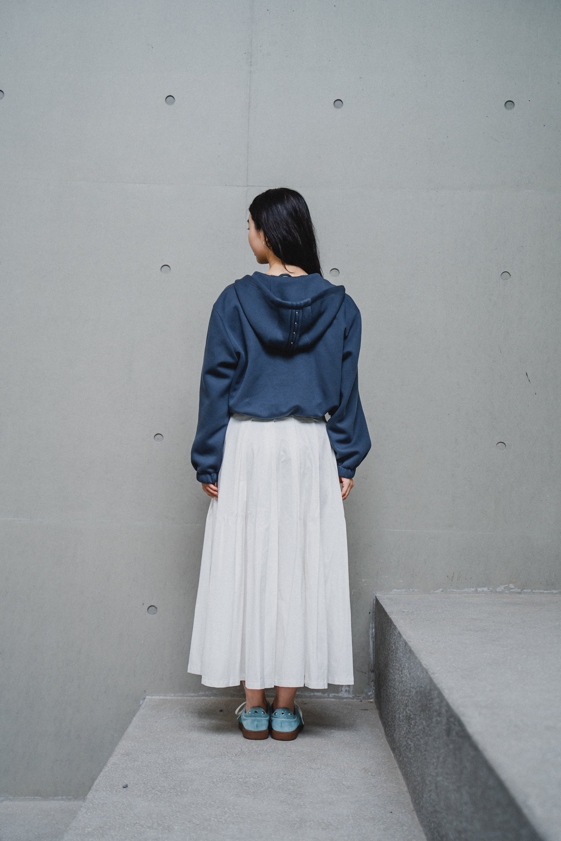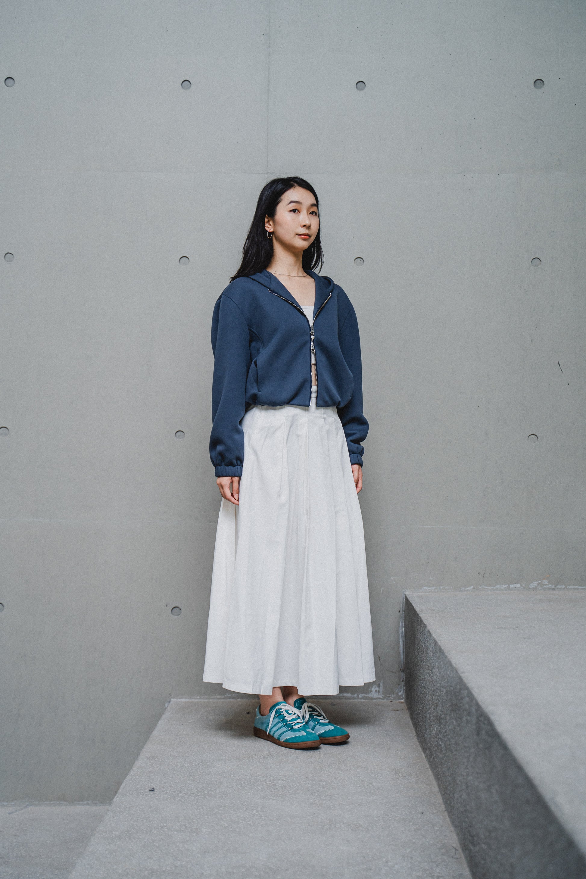 Short-cut design complements A-line skirt, creating a cohesive and standout style
