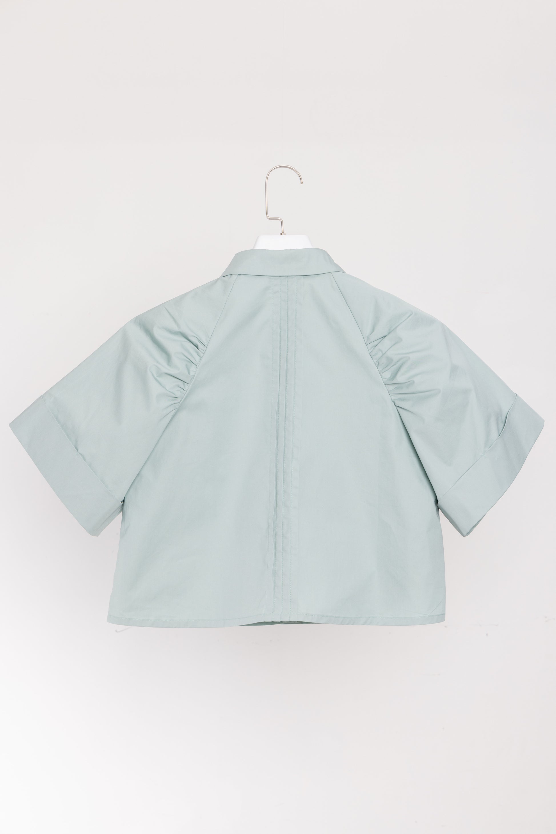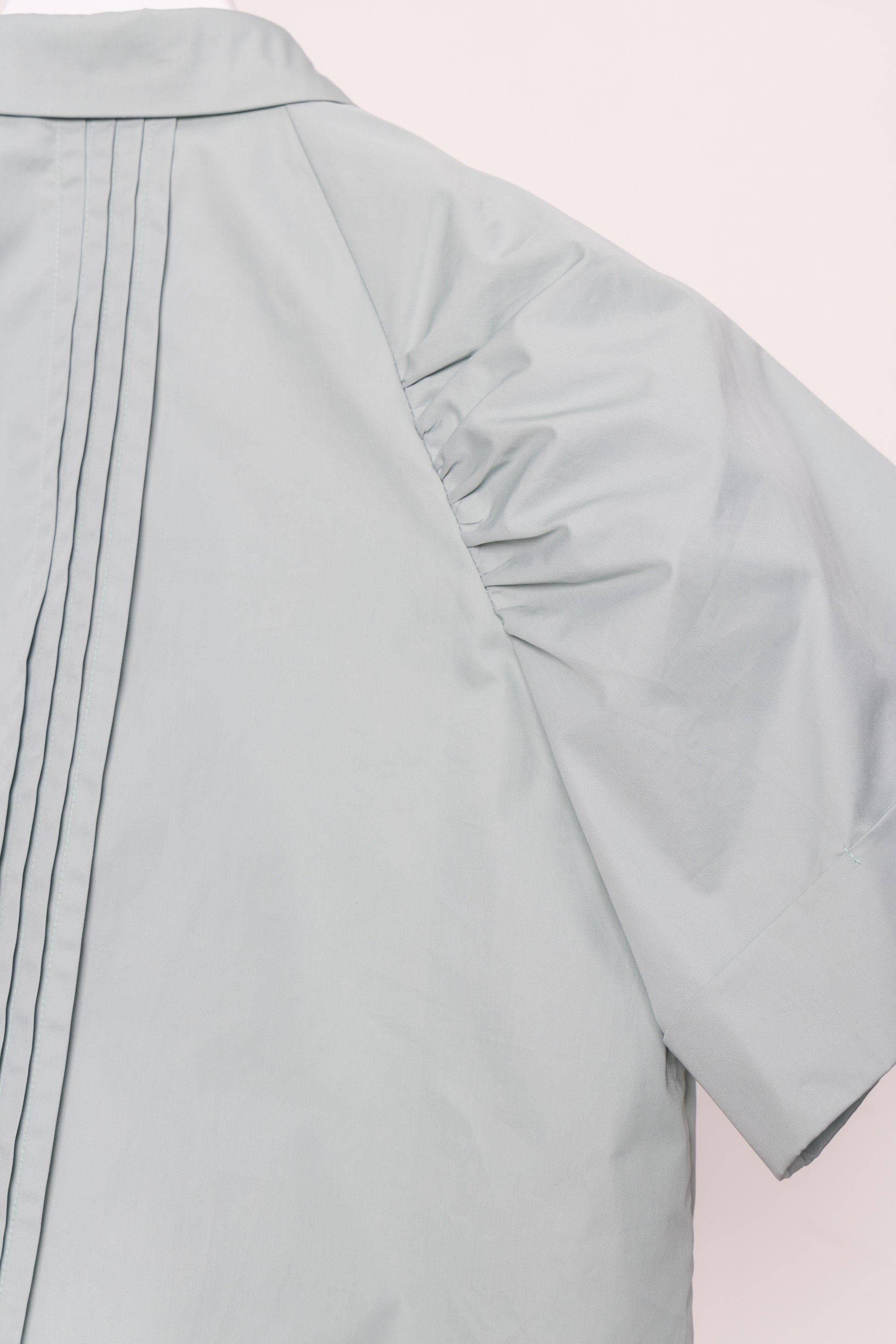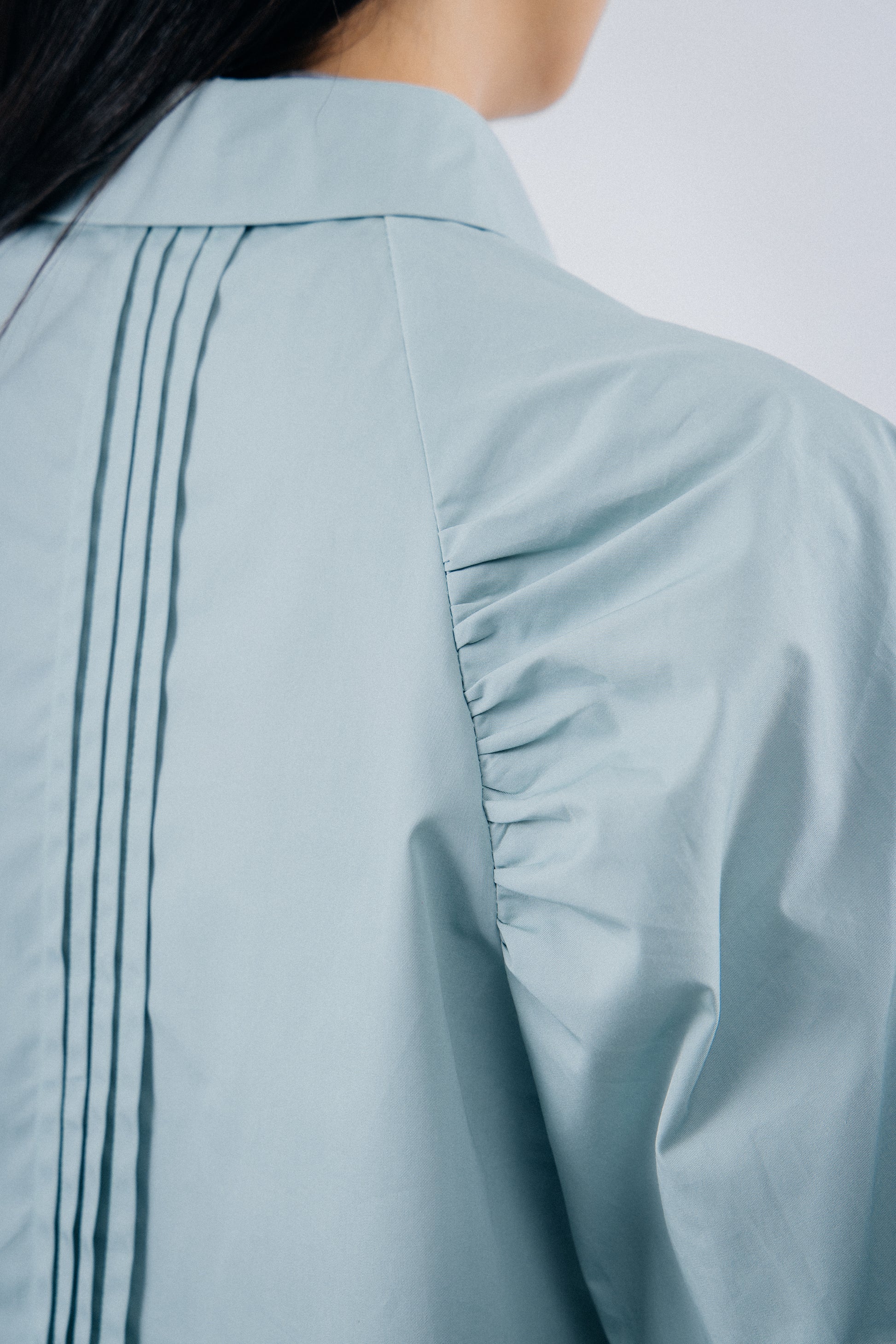 The exquisite pleats on the front and back shoulders add a rich and intricate dimension to the garment, infusing it with a refined sense of style. Complemented by the addition of shell buttons, these unique treasures from the ocean elegantly embellish the garment, accentuating its intricate details.