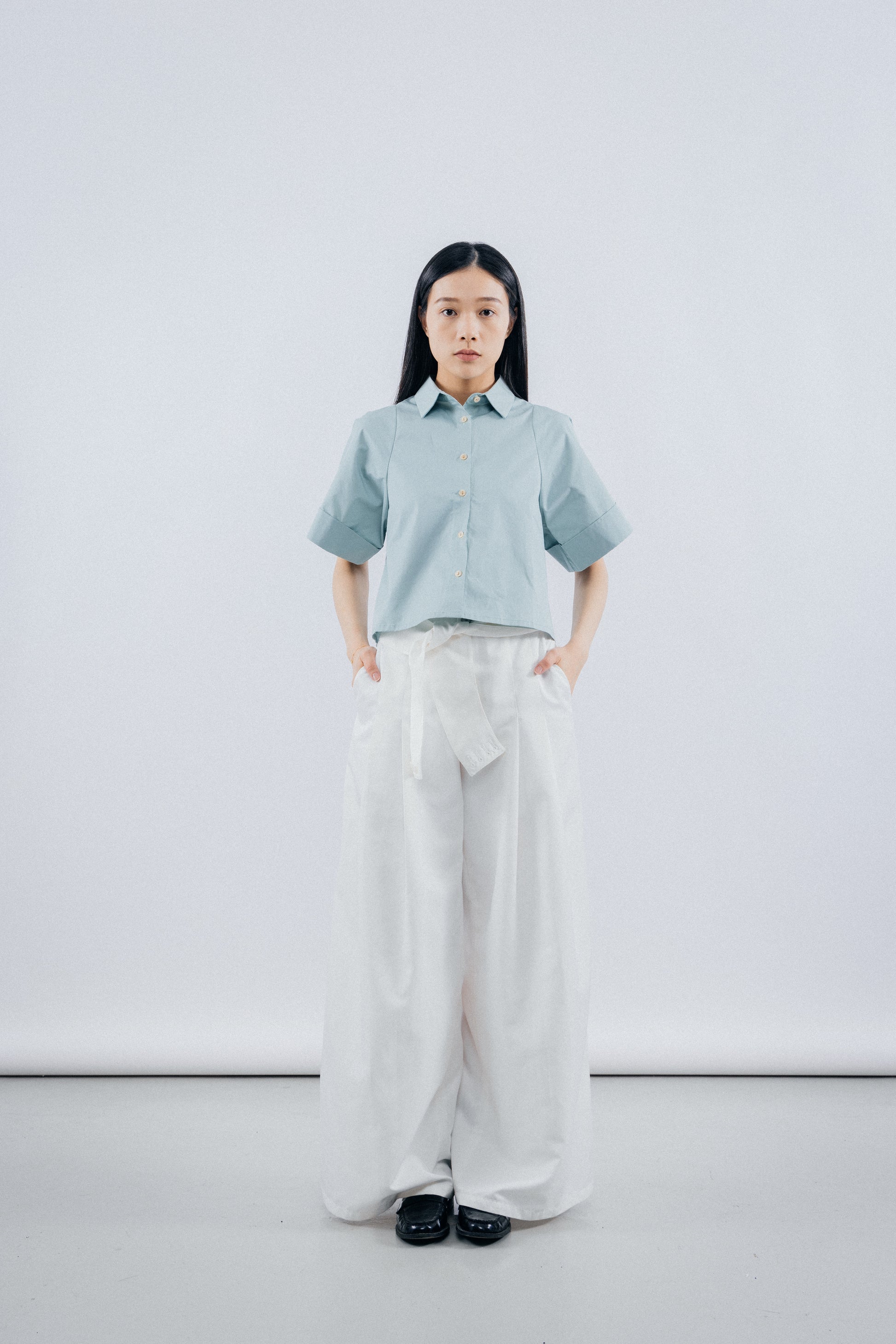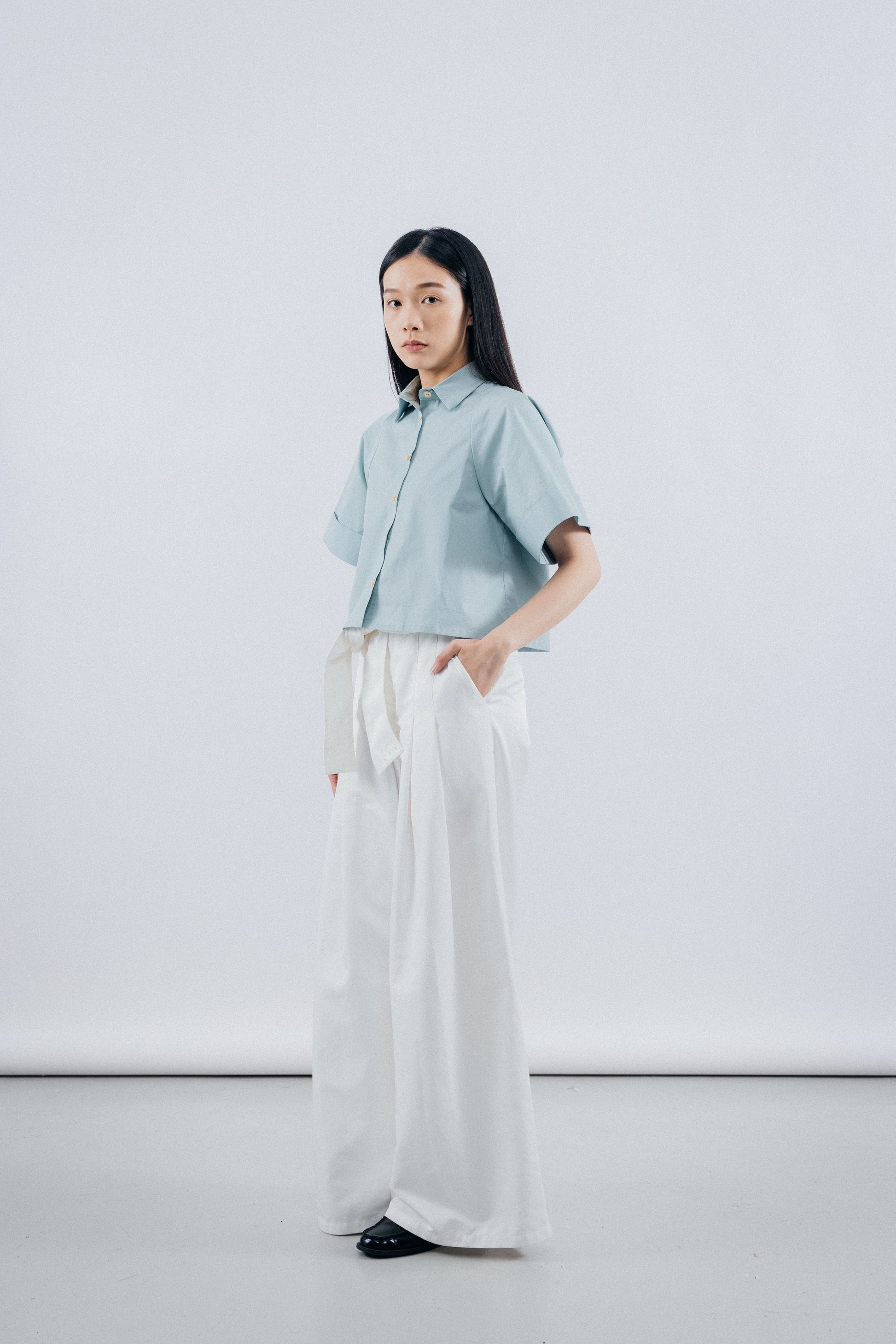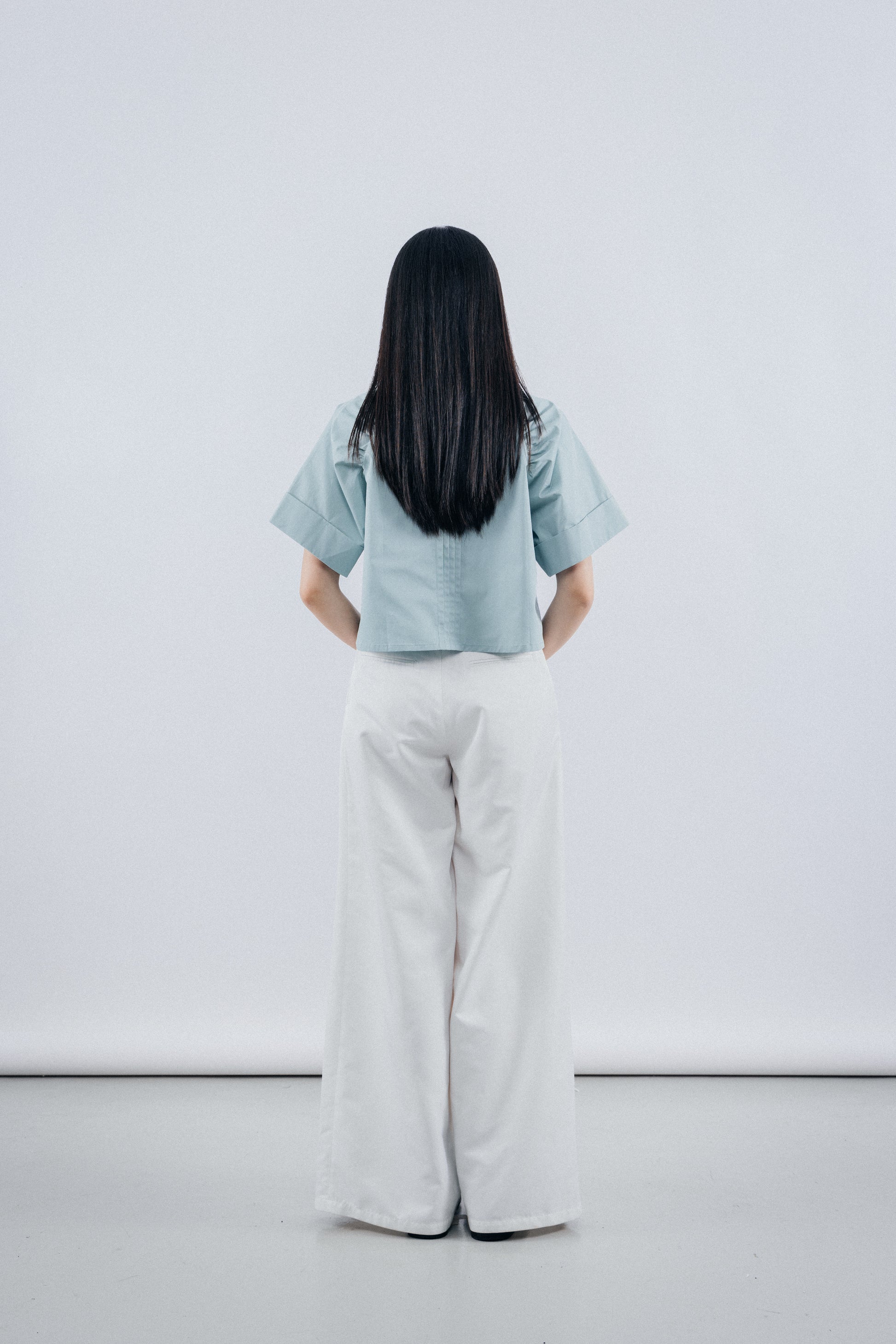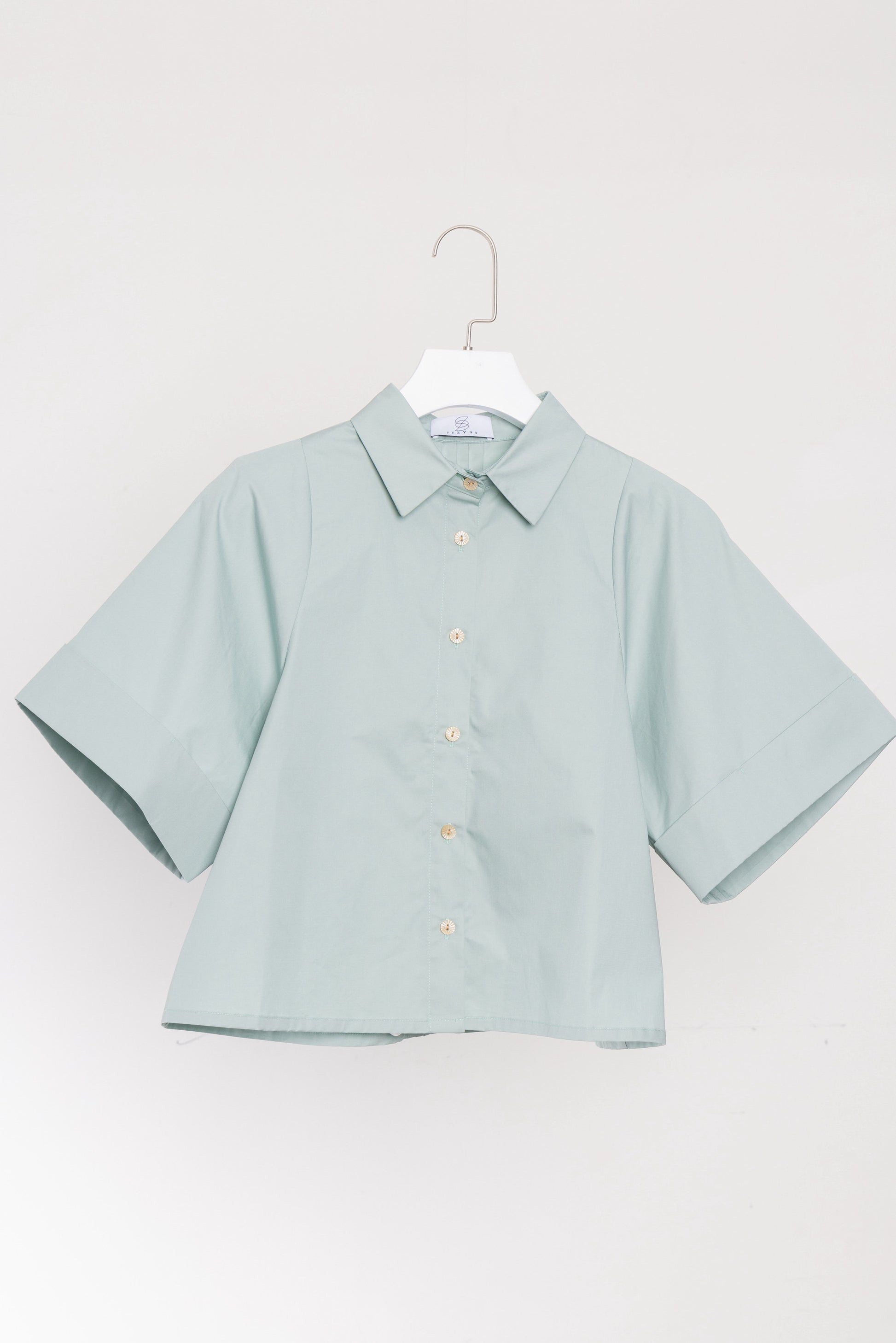 The exquisite pleats on the front and back shoulders add a rich and intricate dimension to the garment, infusing it with a refined sense of style. Complemented by the addition of shell buttons, these unique treasures from the ocean elegantly embellish the garment, accentuating its intricate details.