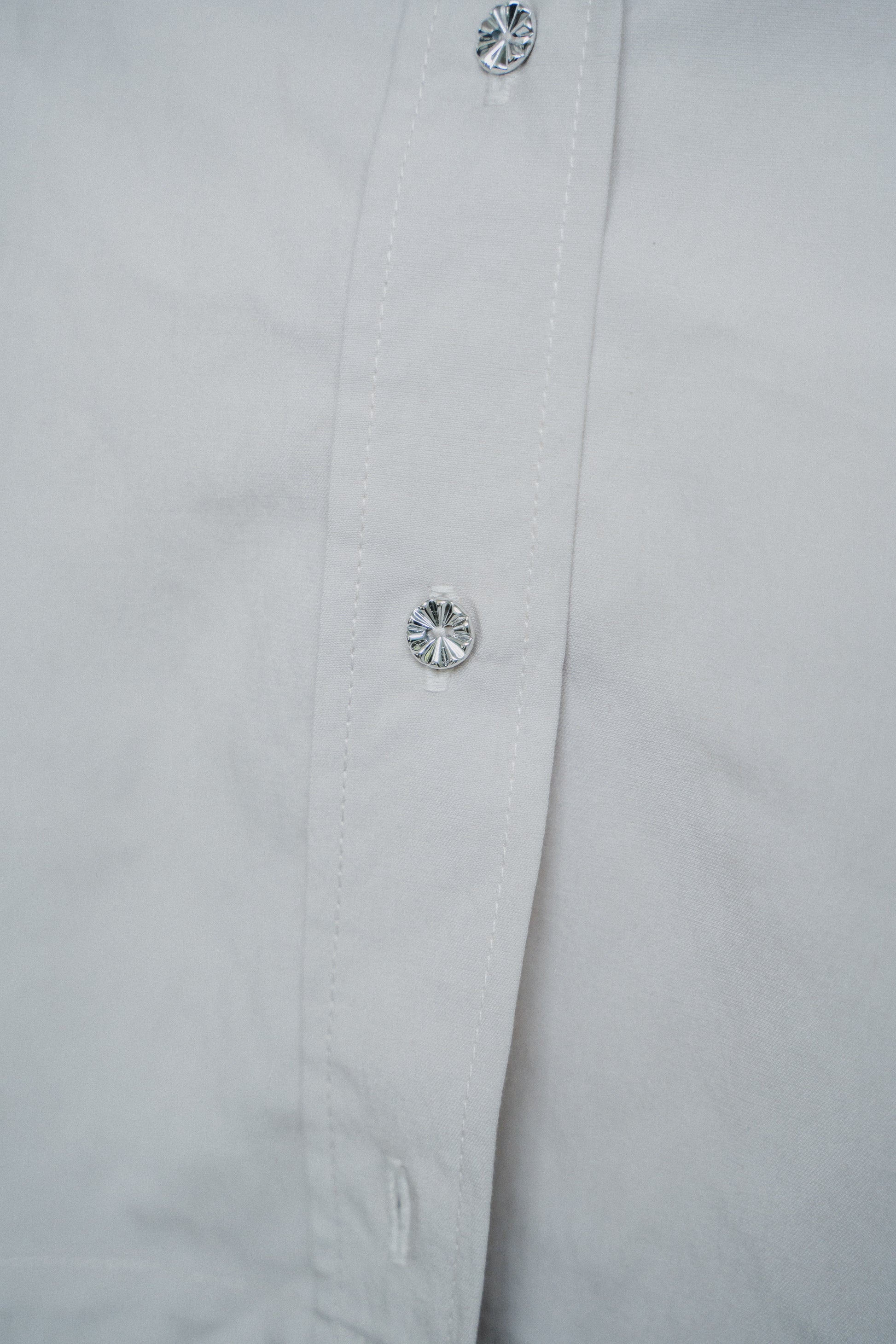 Handcrafted silver buttons, emphasizing precision craftsmanship and elegant texture