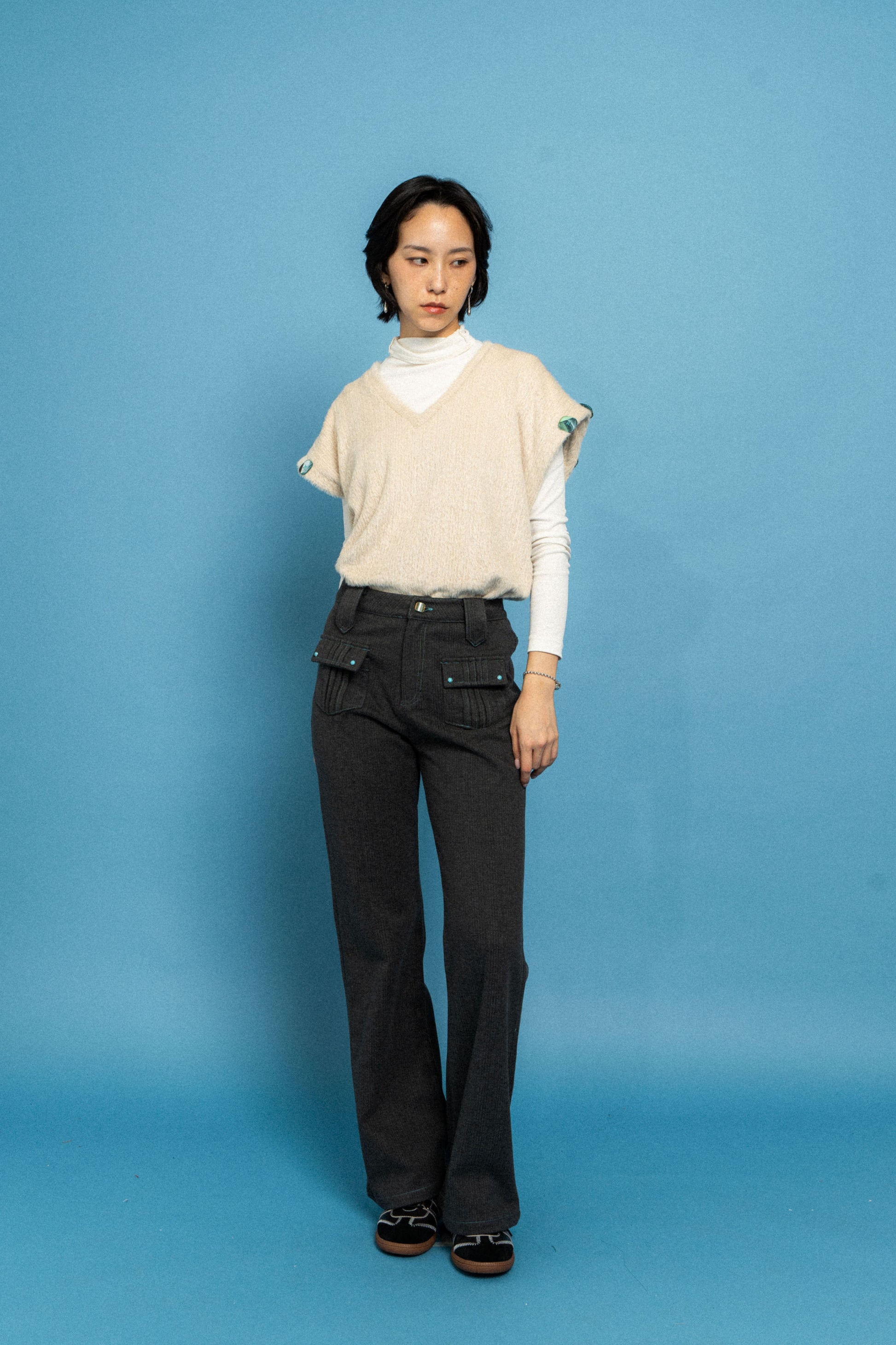Loose-Cut Flared Trousers: The wide-cut flares help to conceal thicker legs, providing a balanced and elegant look.