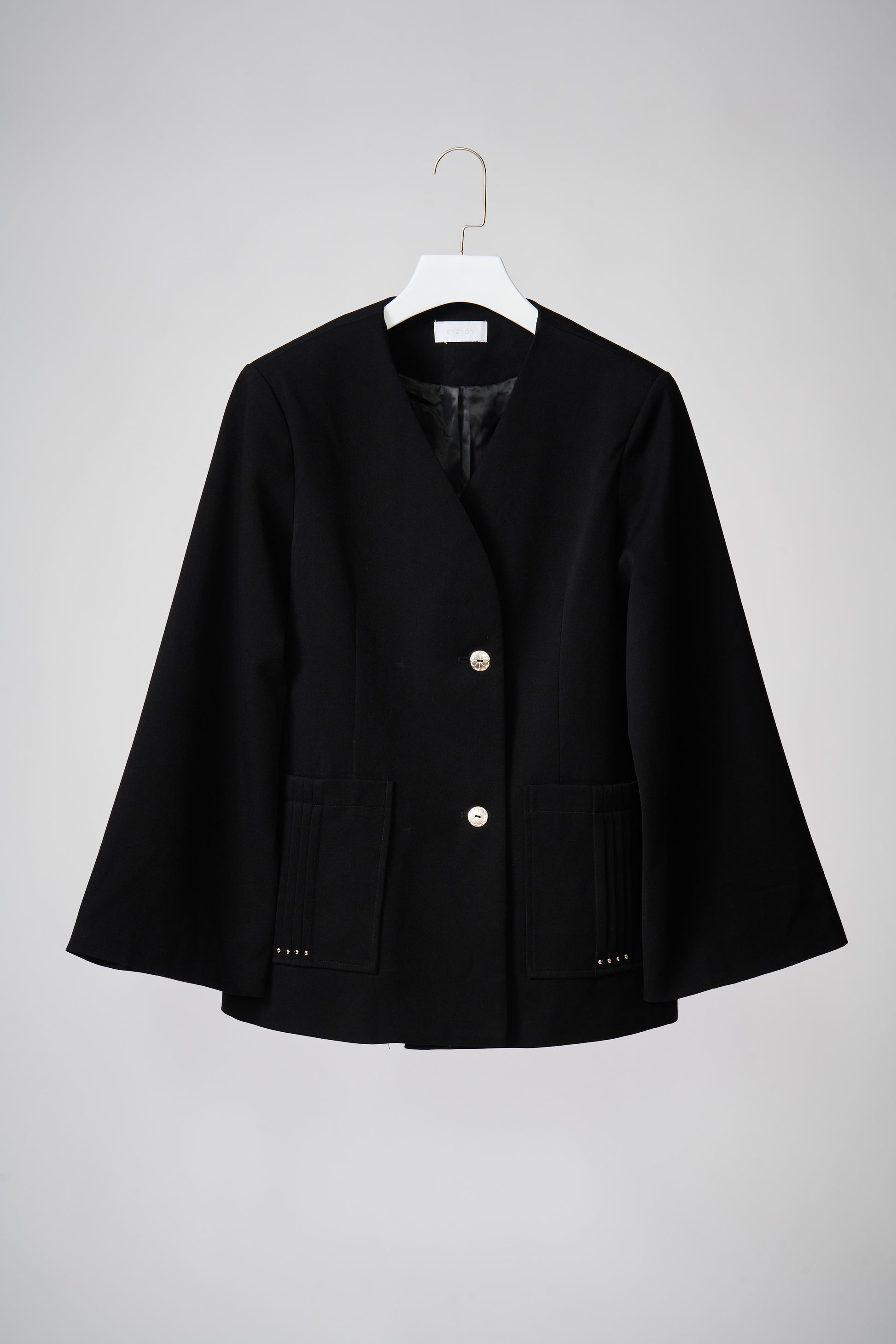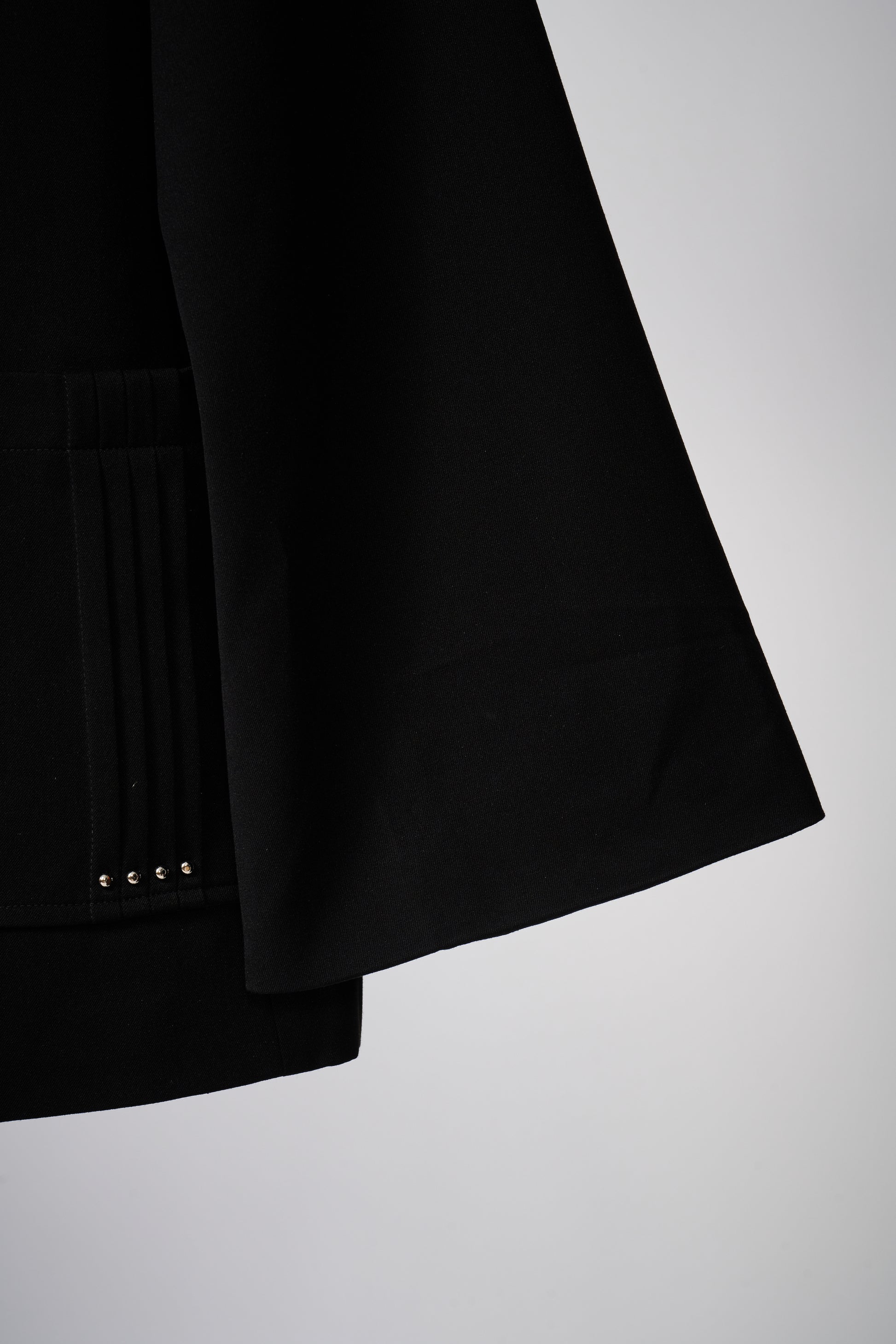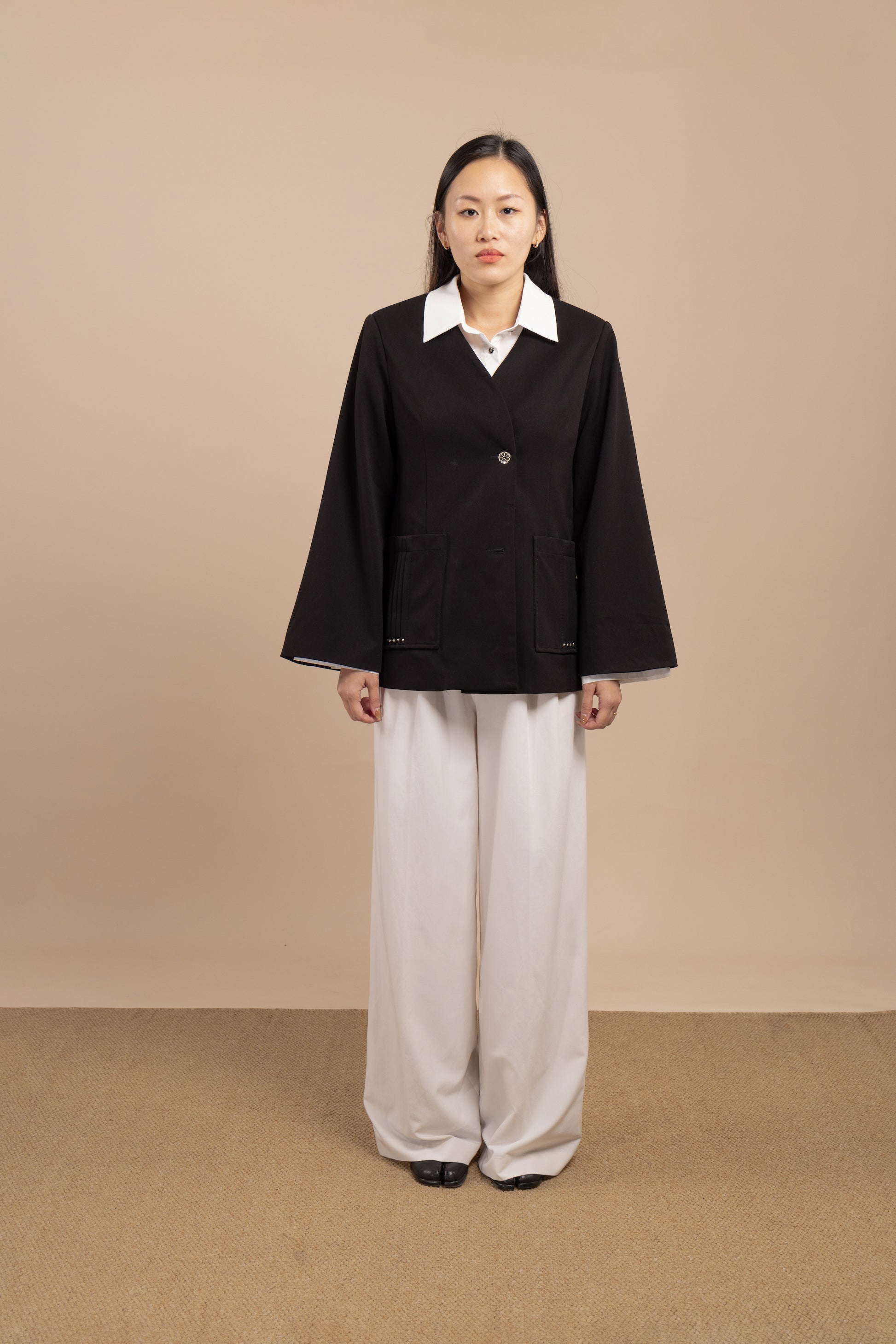 Break free from the conventional impression of a typical suit and effortlessly showcase comfort and ease. By incorporating trumpet sleeves, the refined essence is effortlessly embodied. The overall look becomes more dynamic and sophisticated while maintaining the elegance and formality of a suit.