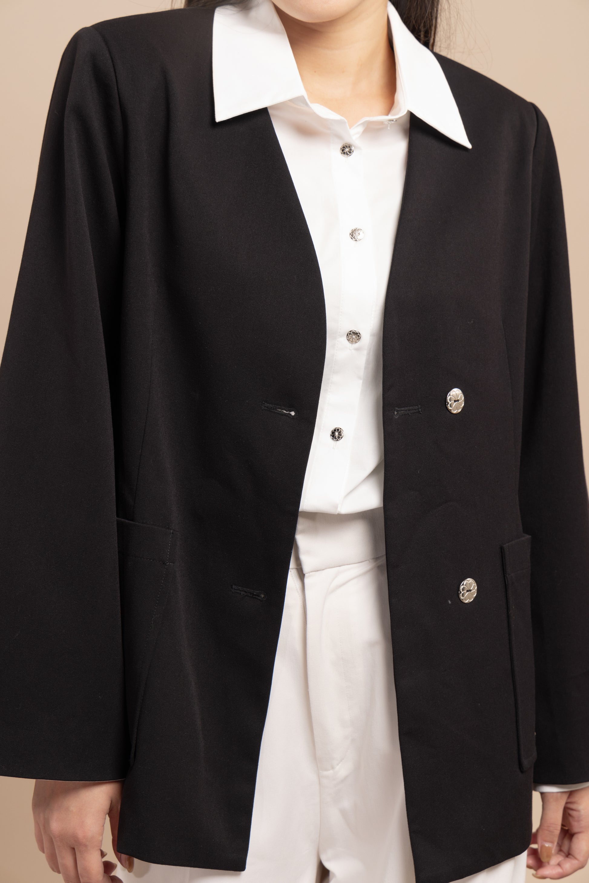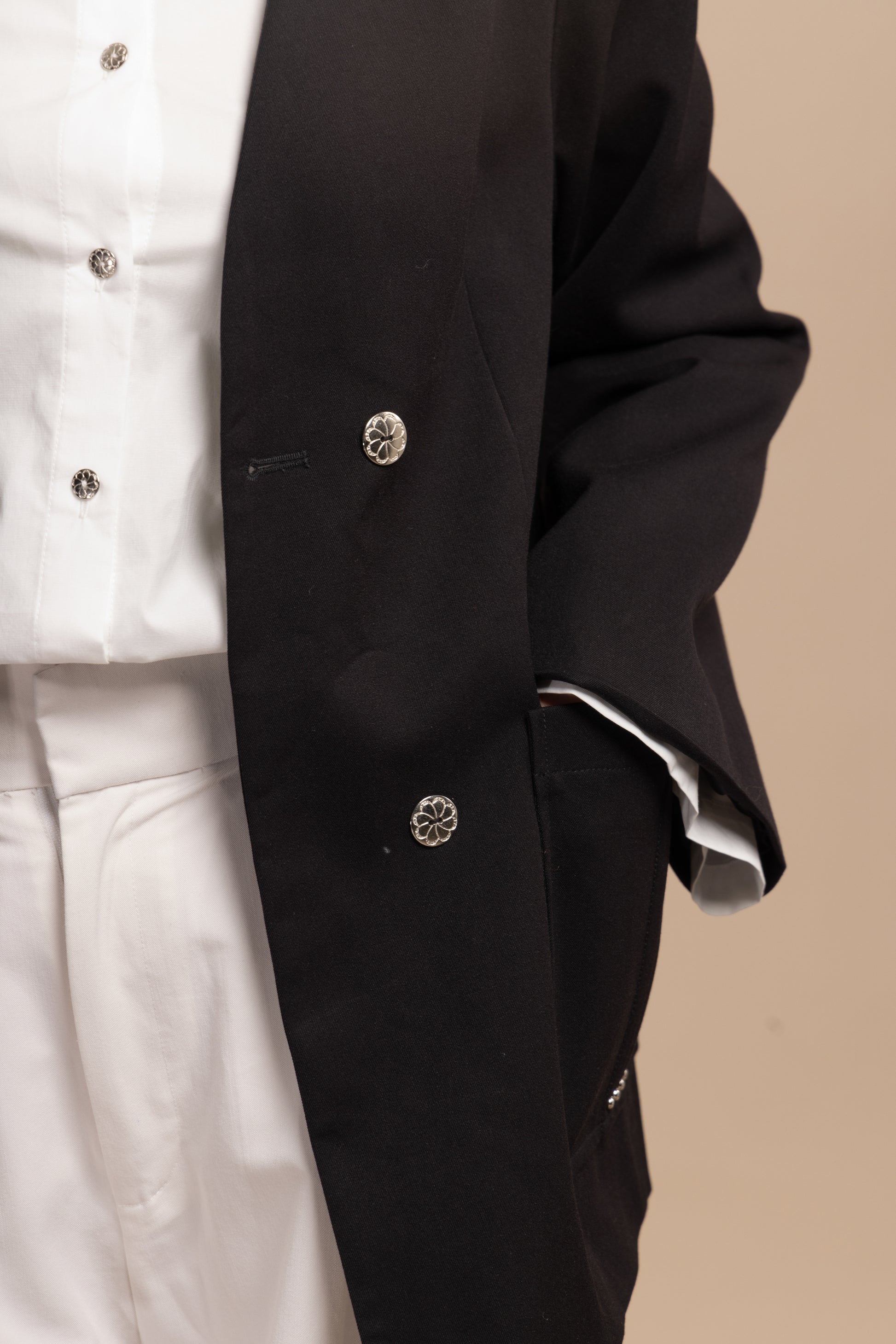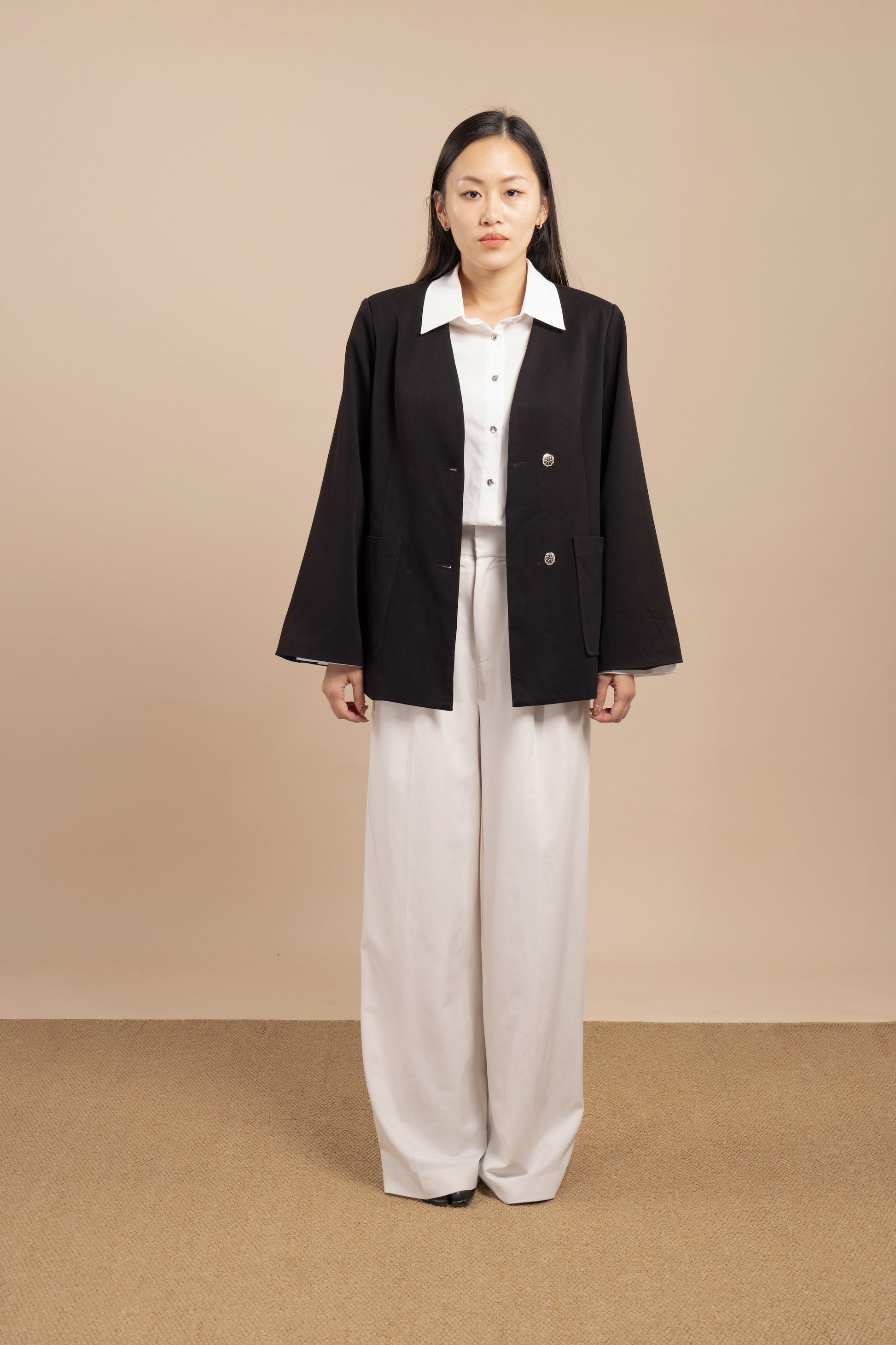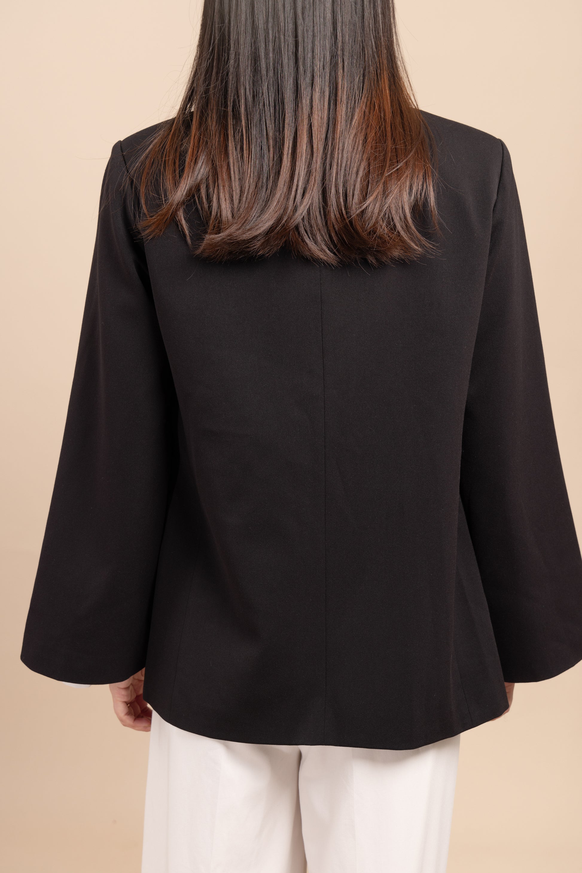 Break free from the conventional impression of a typical suit and effortlessly showcase comfort and ease. By incorporating trumpet sleeves, the refined essence is effortlessly embodied. The overall look becomes more dynamic and sophisticated while maintaining the elegance and formality of a suit.