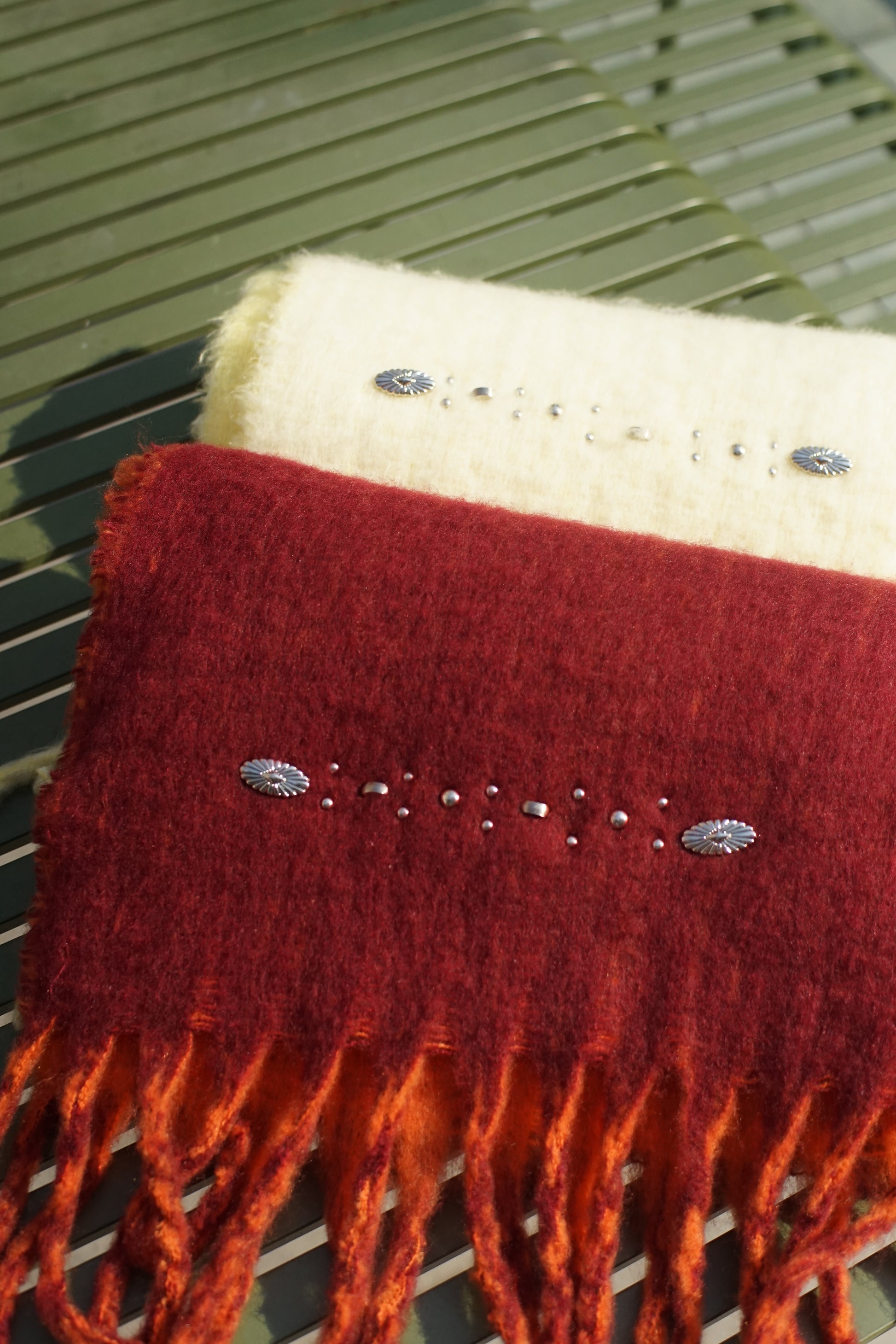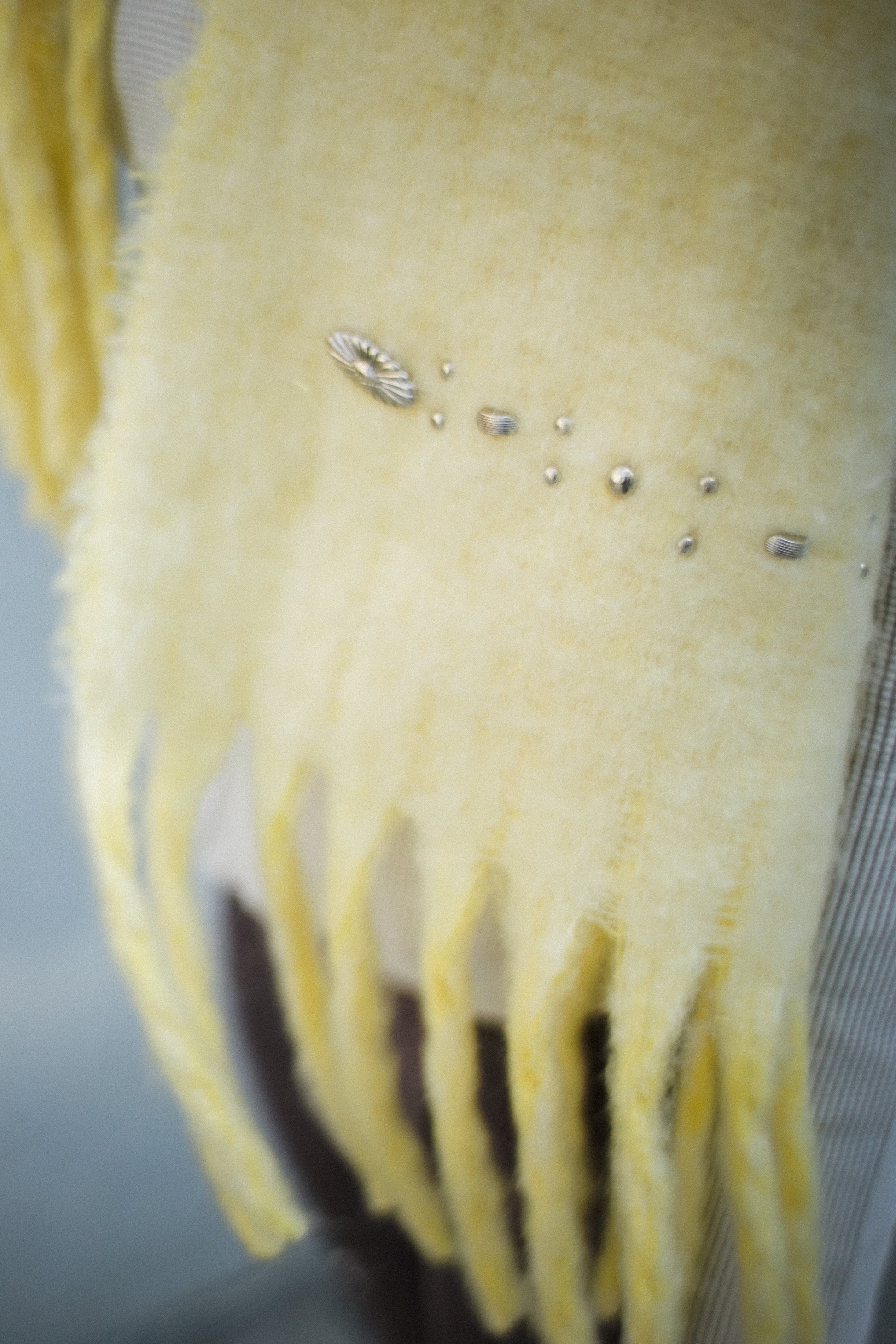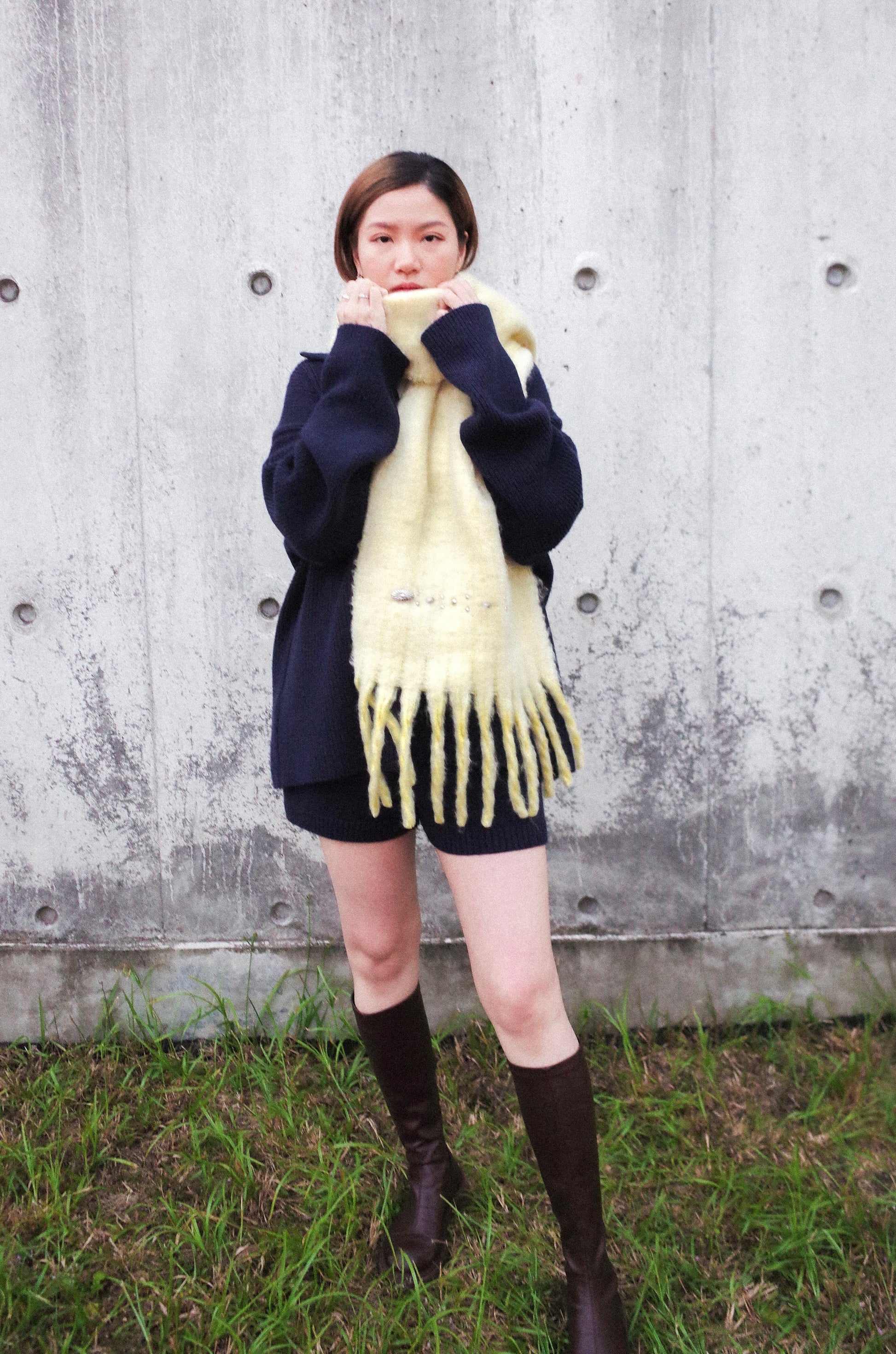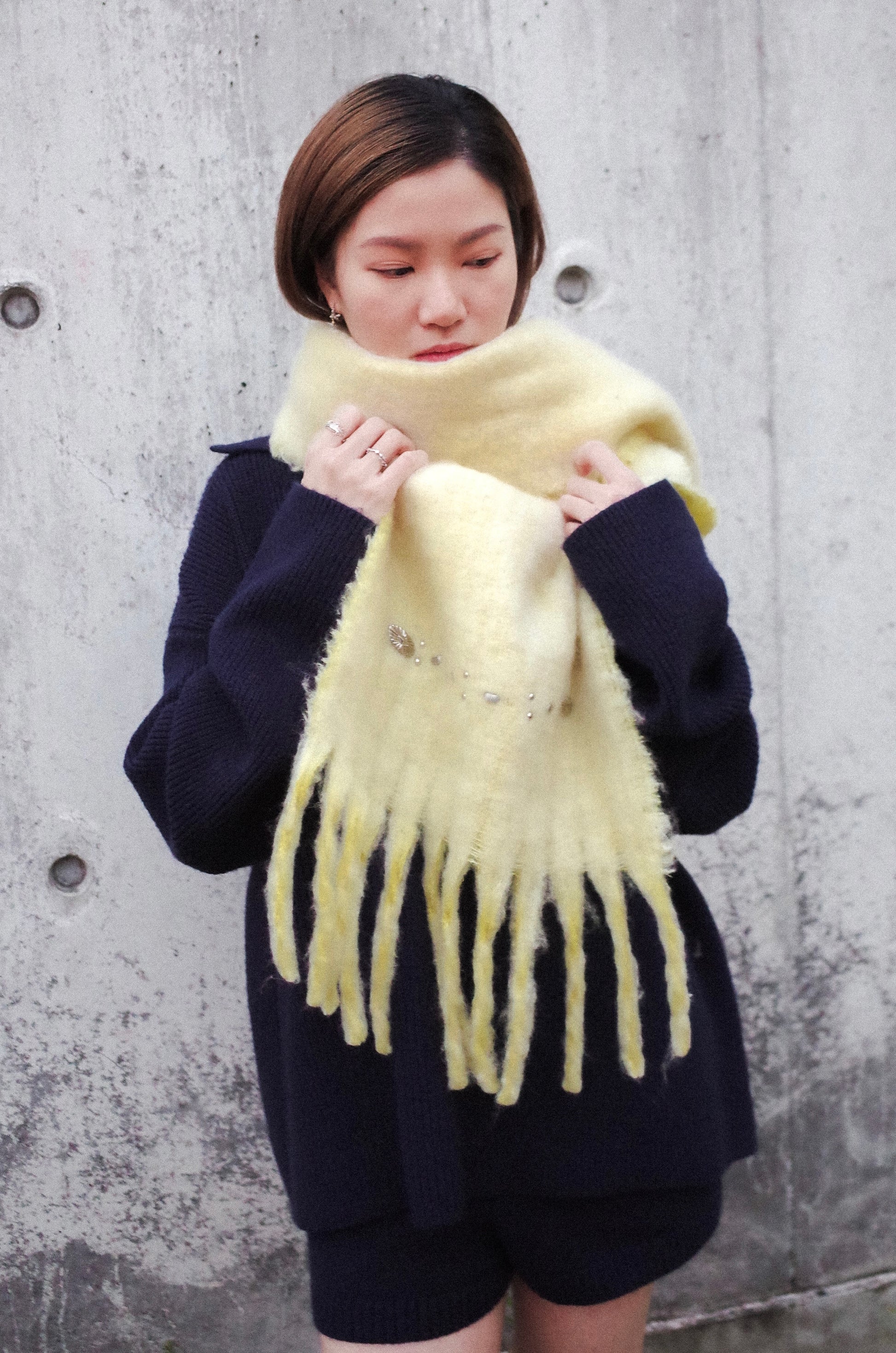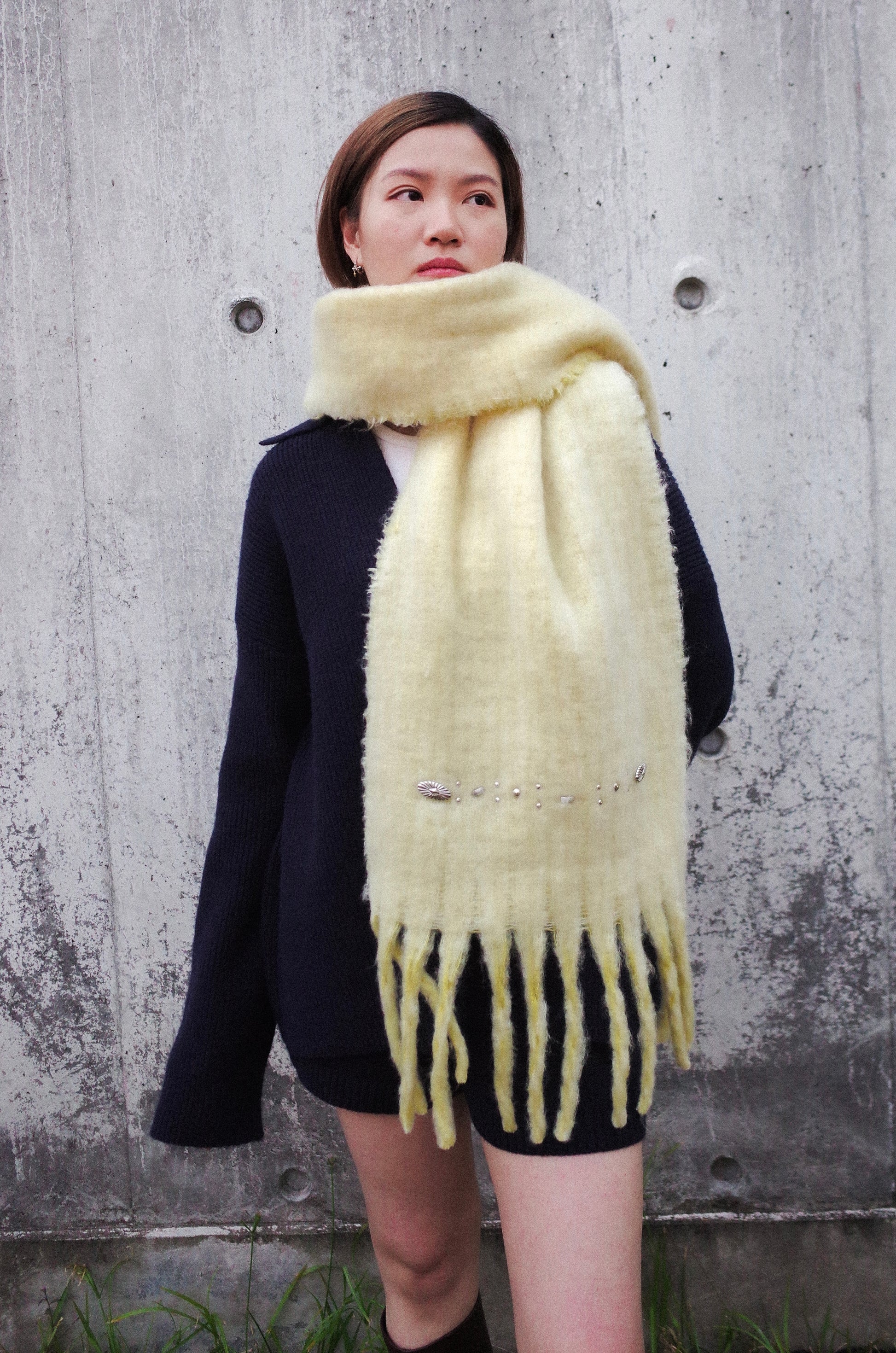 The change in seasons calls for warm accessories like this scarf. It's knitted from premium mohair and wool that's brushed for a soft, tactile hand feel and features a SYZYGY emblem and fringed ends.
