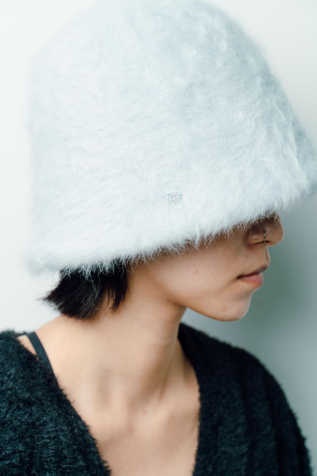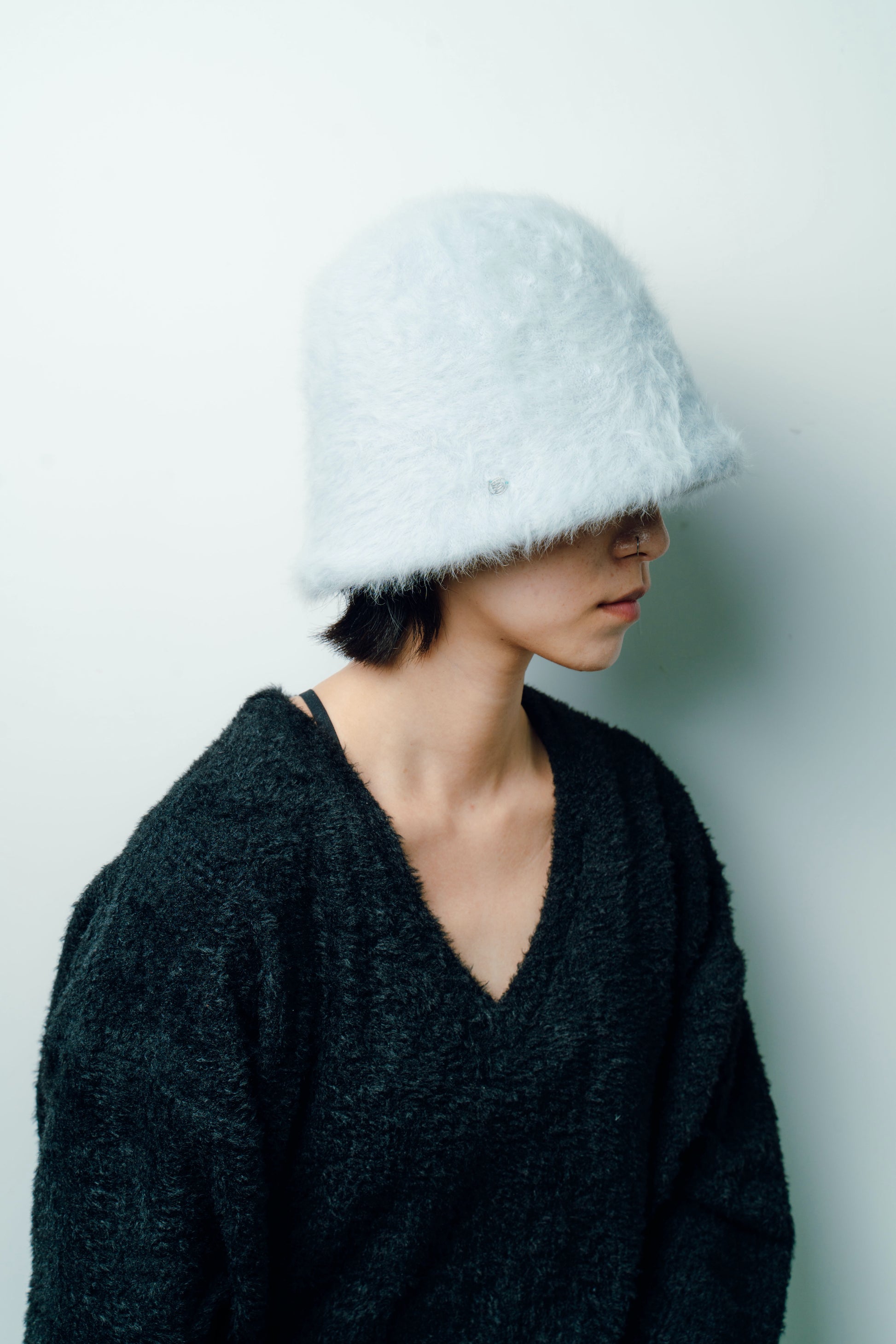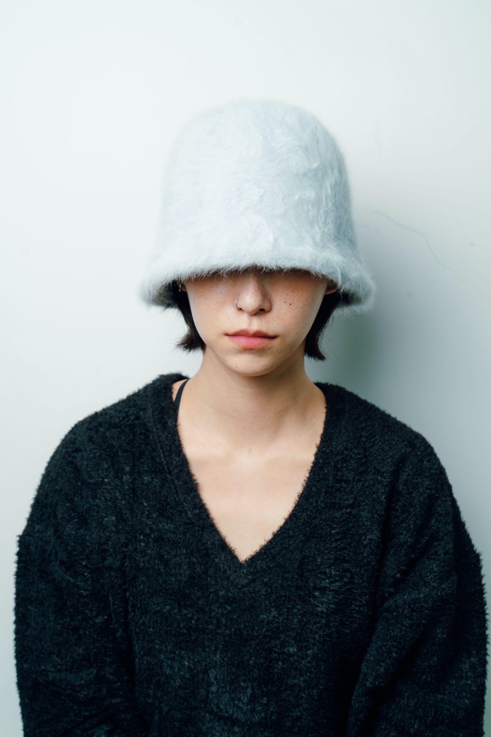 This bucket hat is an easy way to add texture to an outfit. it's knitted from a tactile mohair blend in a ribbed cardigan stitch and has an extended brim.