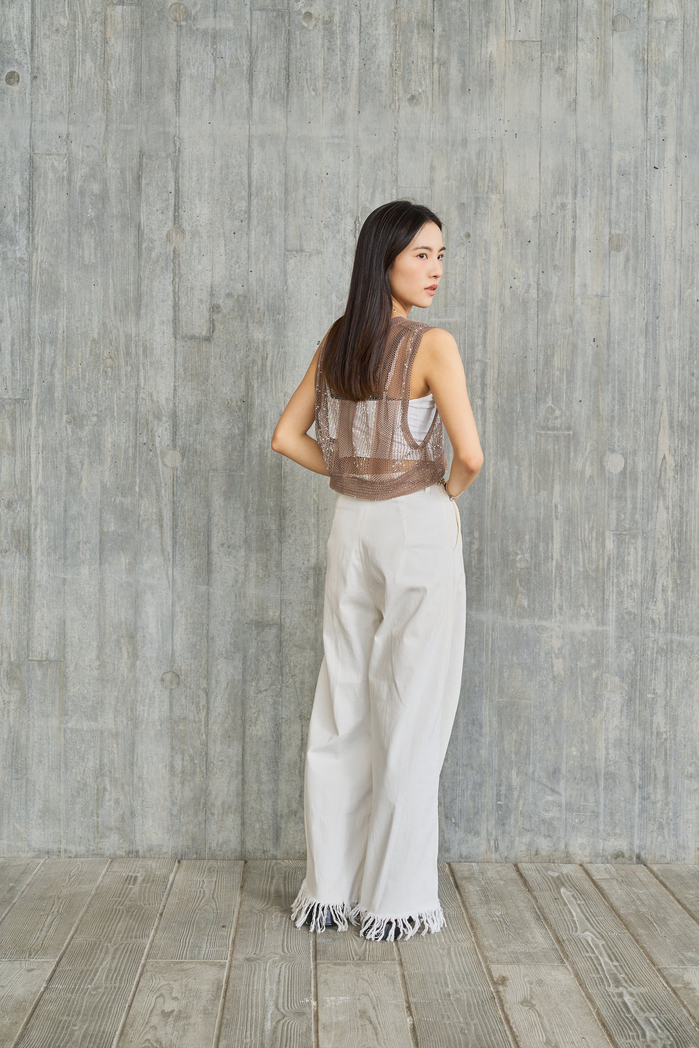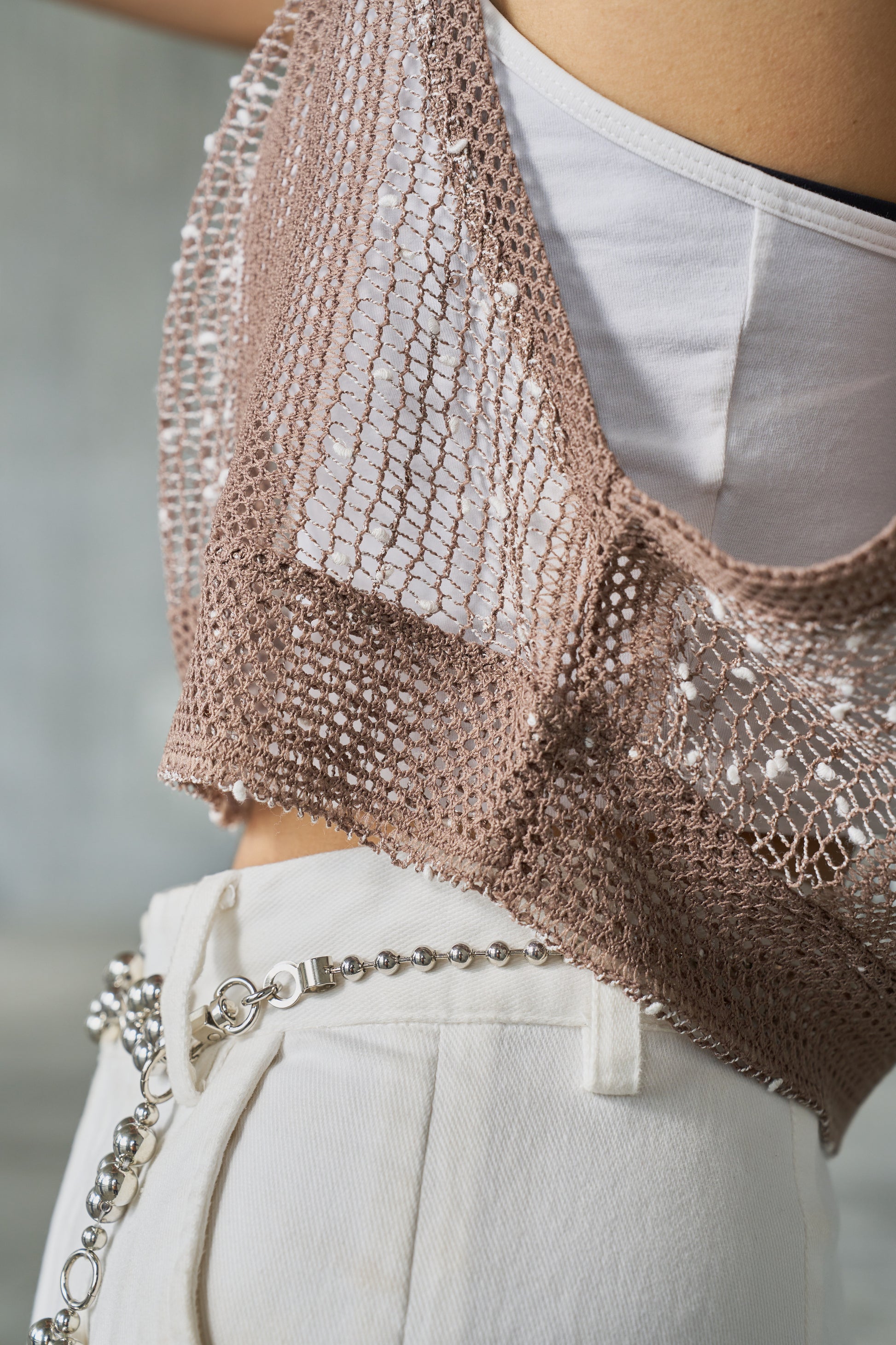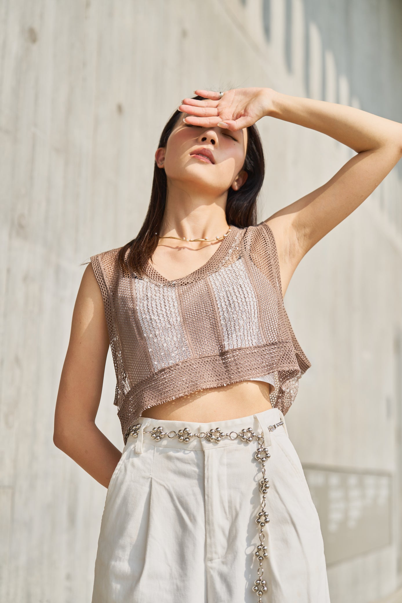 This vest is a must-have item for the summer season. It features a mesh see-through design made from different weaving techniques that provide a soft and comfortable feel. It can be worn on its own or layered with other clothing for different styles.