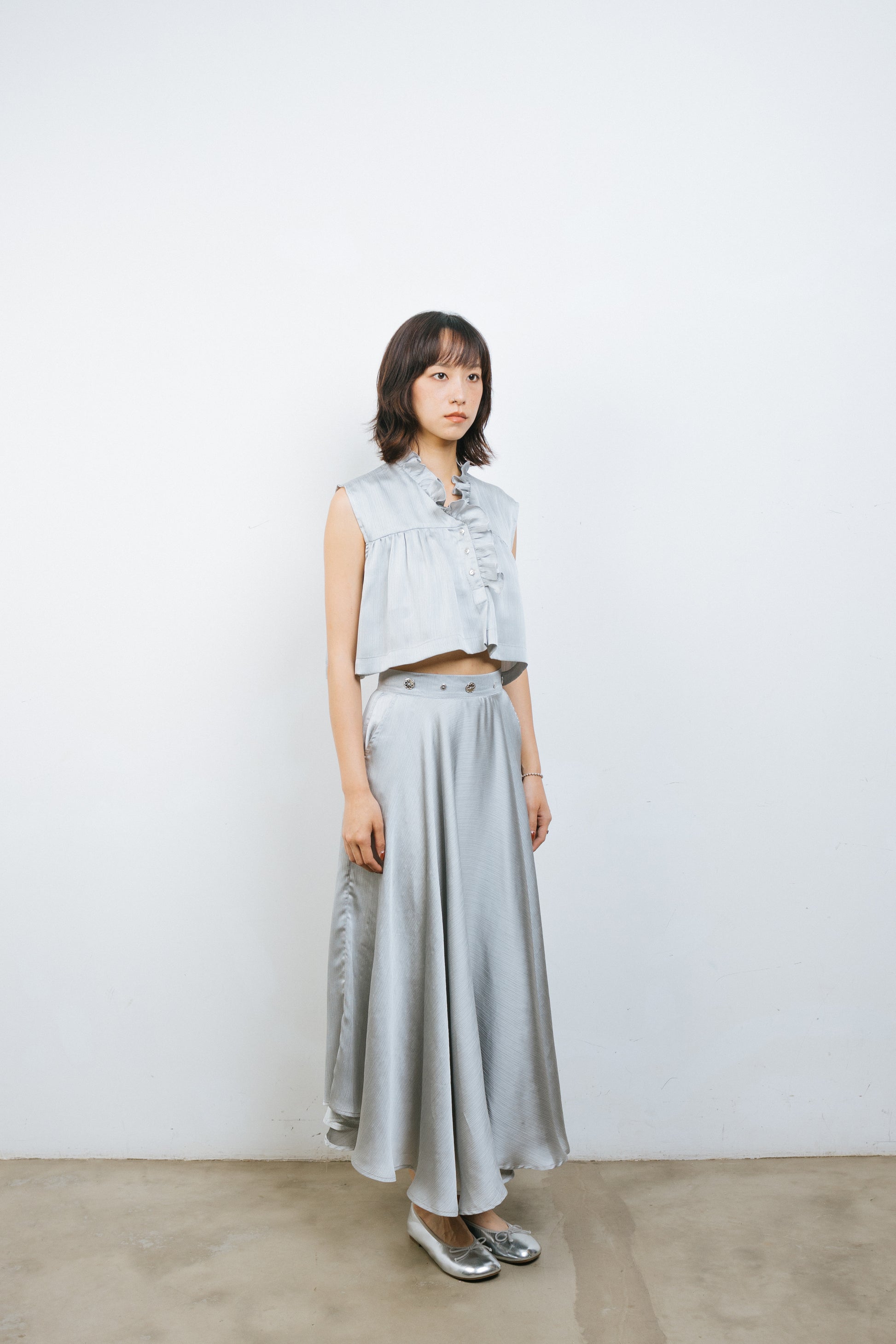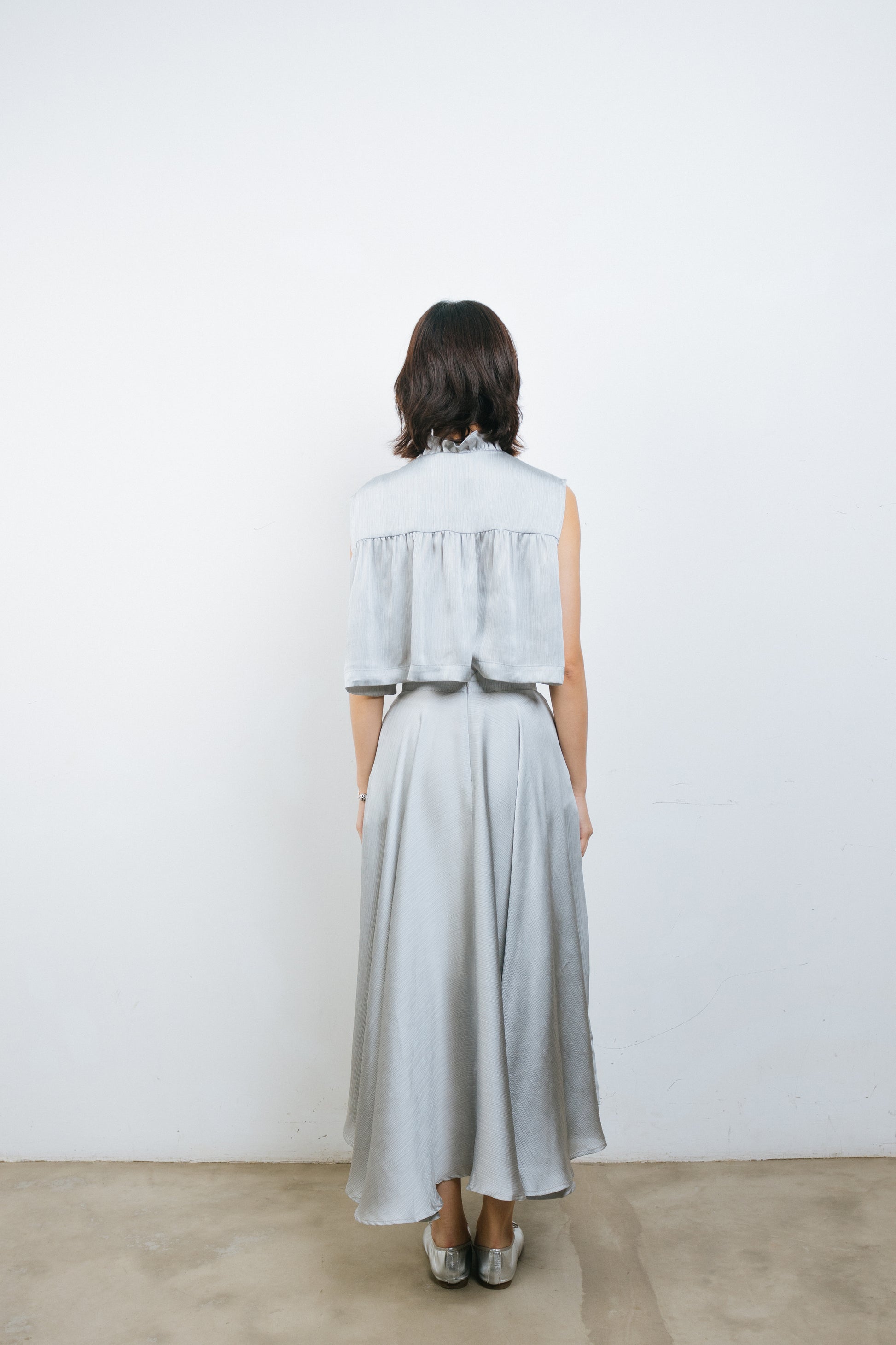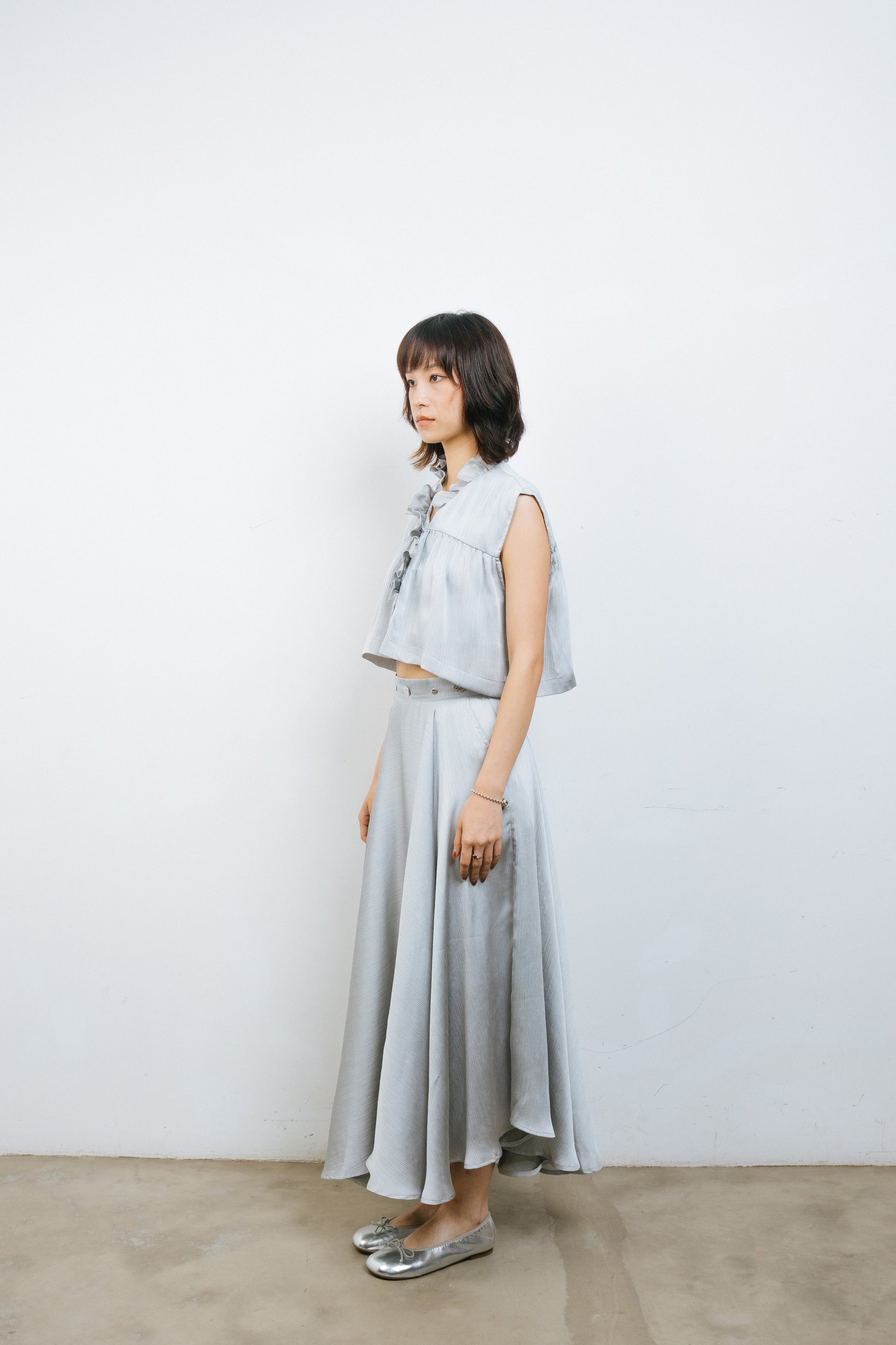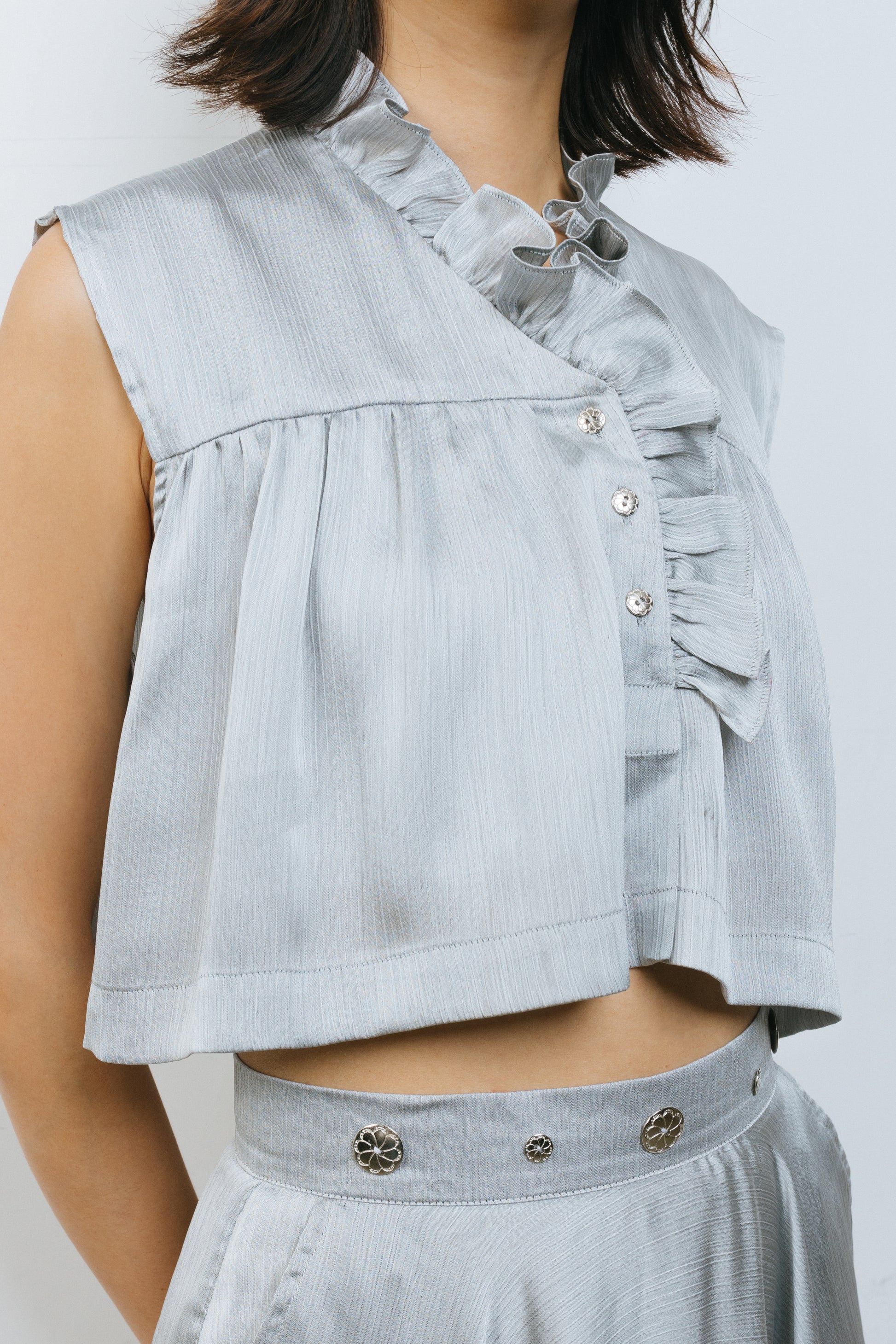 The silver fabric of this top is able to reflect a bright shine, adding a unique sparkling effect to your outfit. In addition to its feminine charm, the delicate ruffled detailing on the collar adds a touch of elegant femininity to the garment while also bringing a neutral sense of fashion. The lightweight and transparent texture of the top also provides a comfortable and relaxed wearing experience. With its simple and understated design, this top is suitable for everyday wear, yet it still retains a special and distinctive quality. Overall, this is an excellent clothing item that combines simplicity, elegance, and comfort.