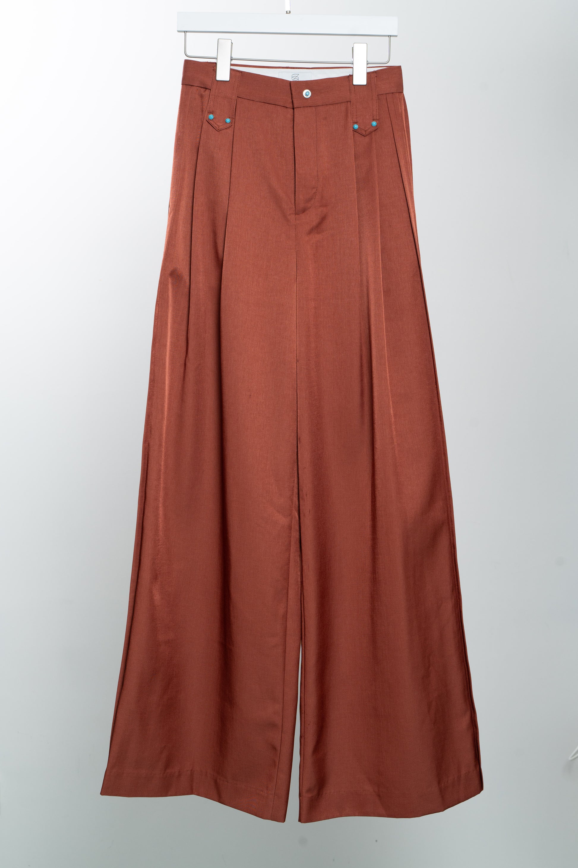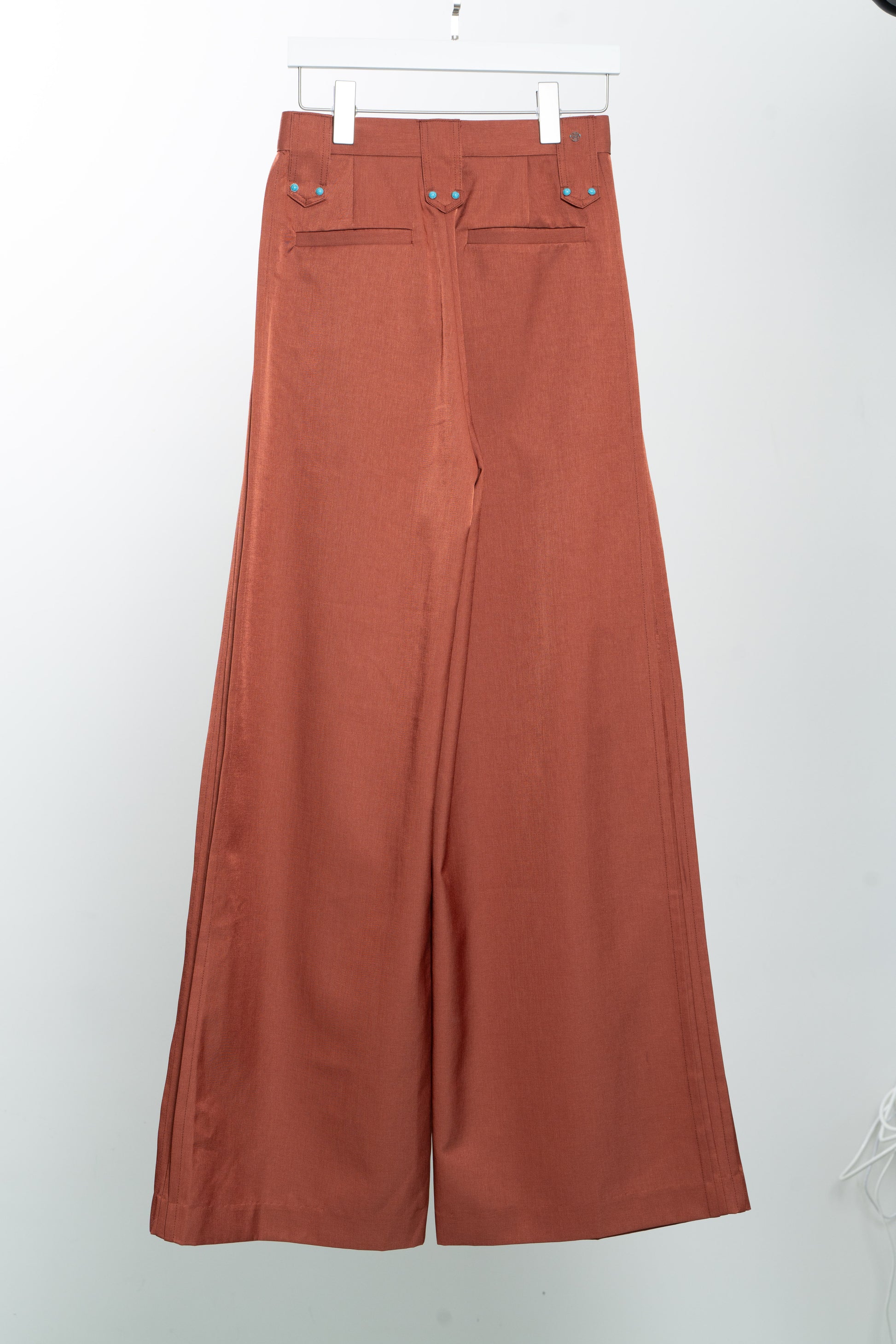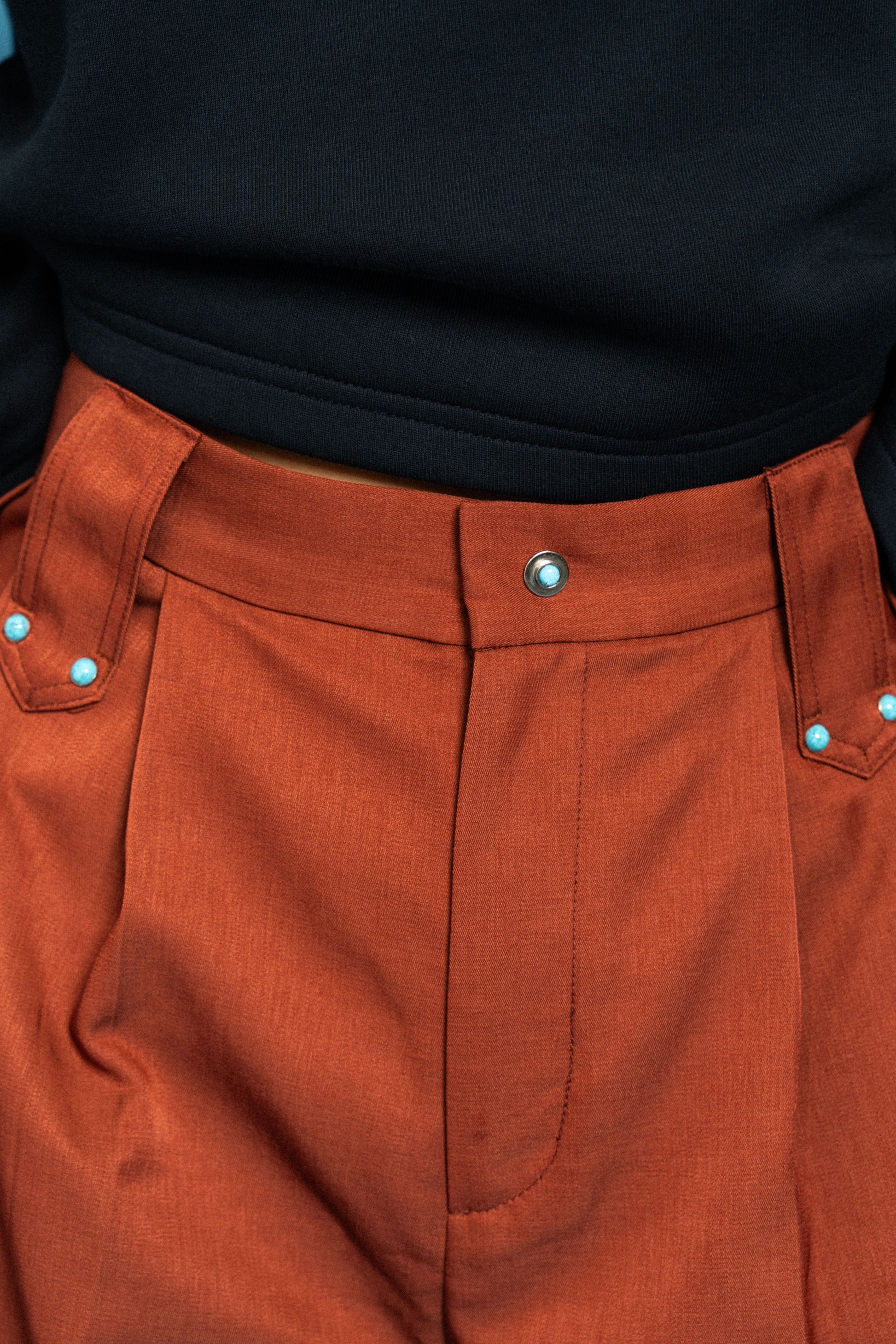 Hybrid Design of Tailored and Casual: The trousers combine a classic dress pant cut with casual elements, featuring decorative studs and back patch pockets. This versatile design allows for effortless transitions between formal and relaxed settings.