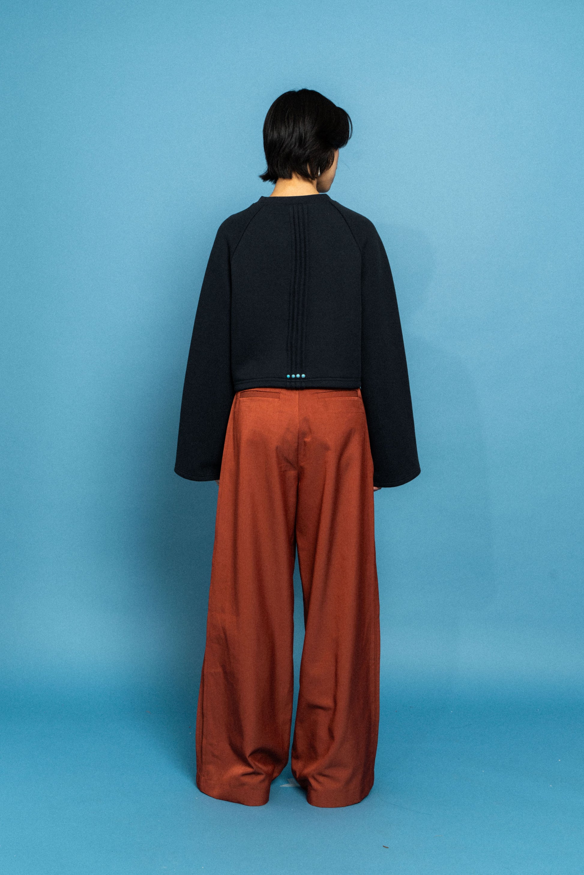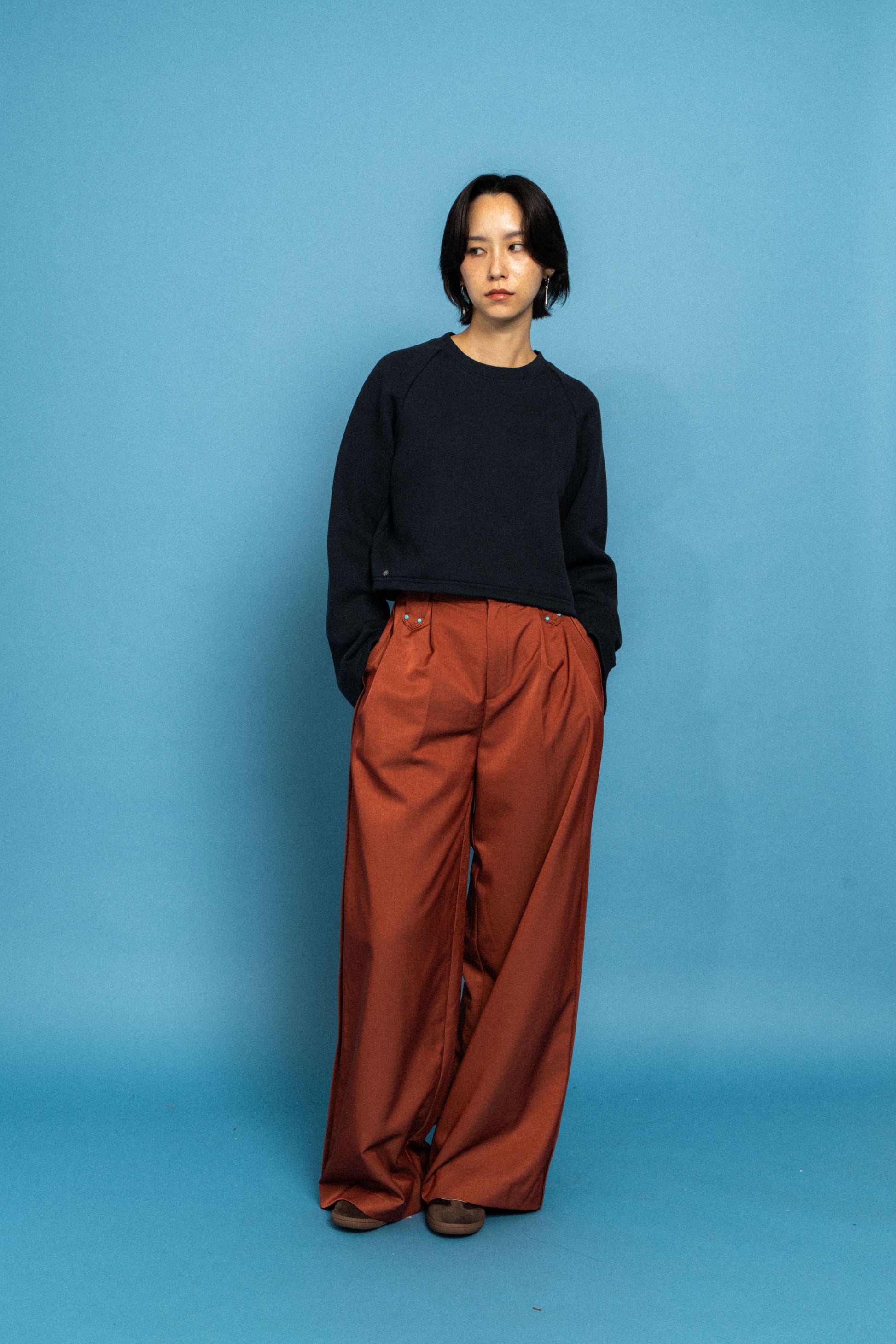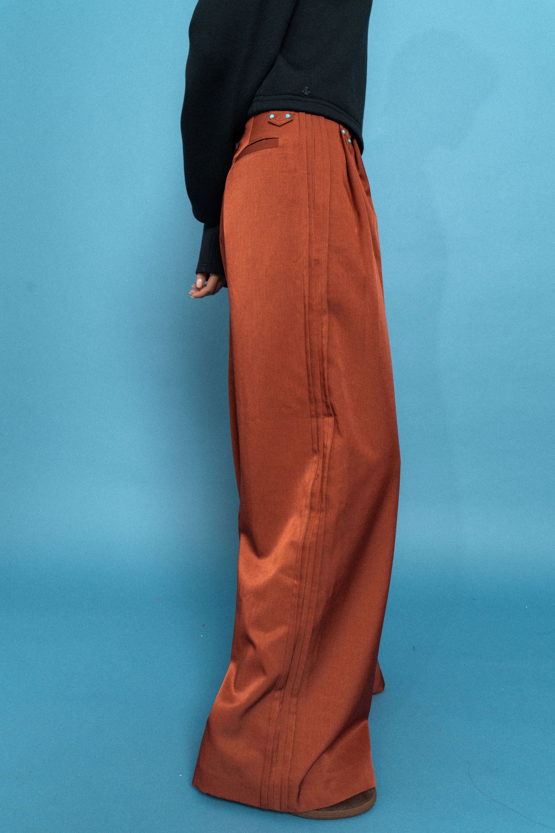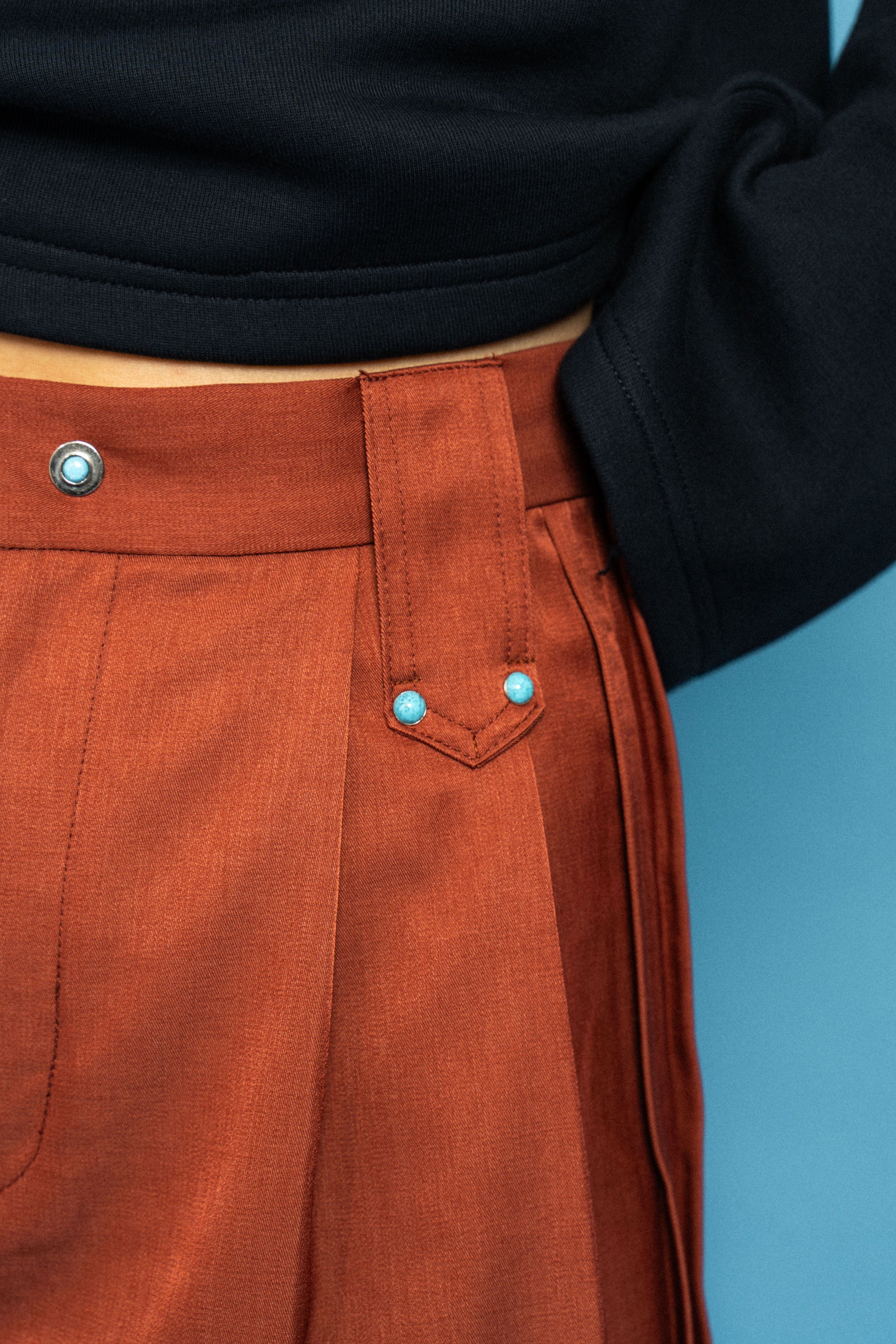 Hybrid Design of Tailored and Casual: The trousers combine a classic dress pant cut with casual elements, featuring decorative studs and back patch pockets. This versatile design allows for effortless transitions between formal and relaxed settings.