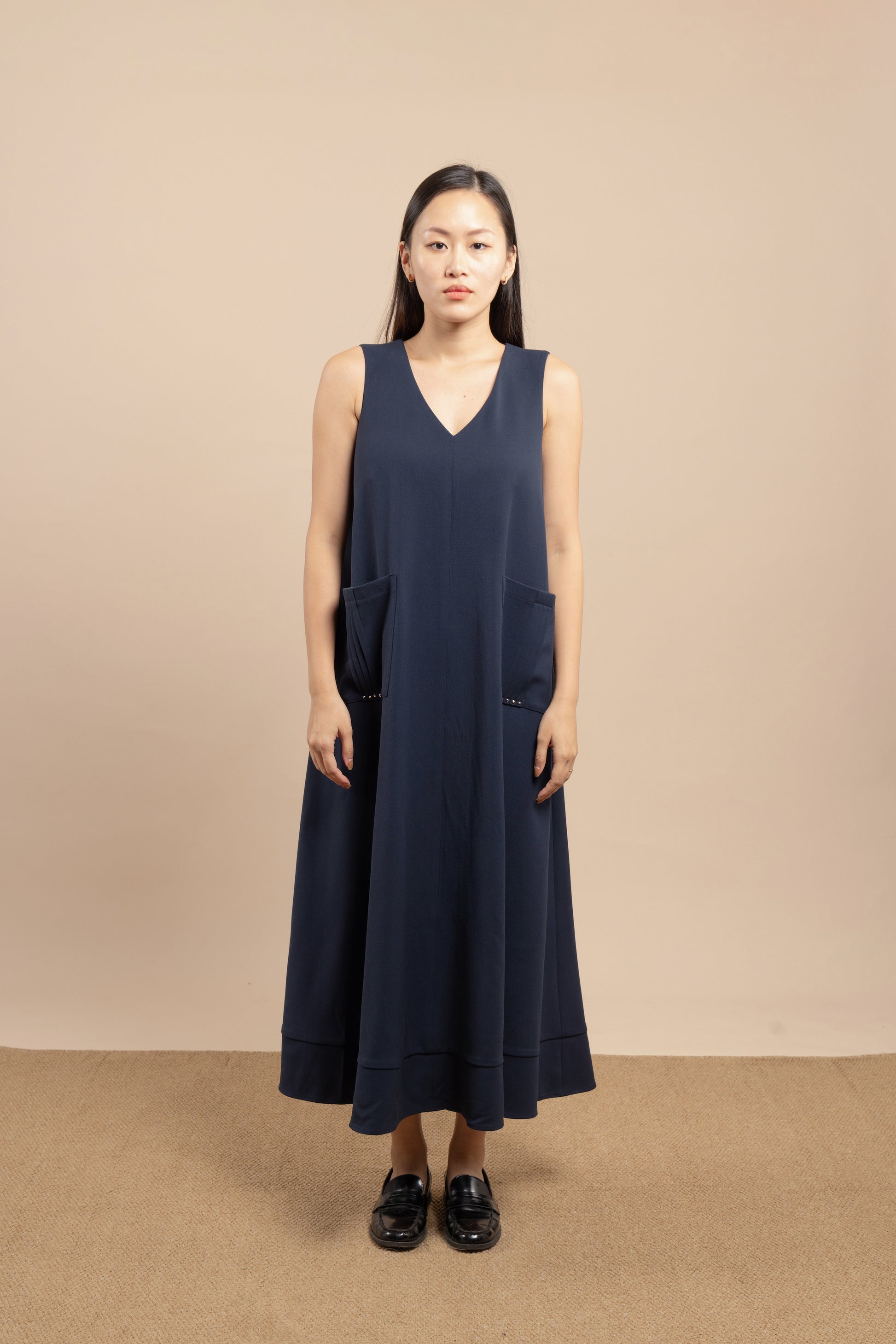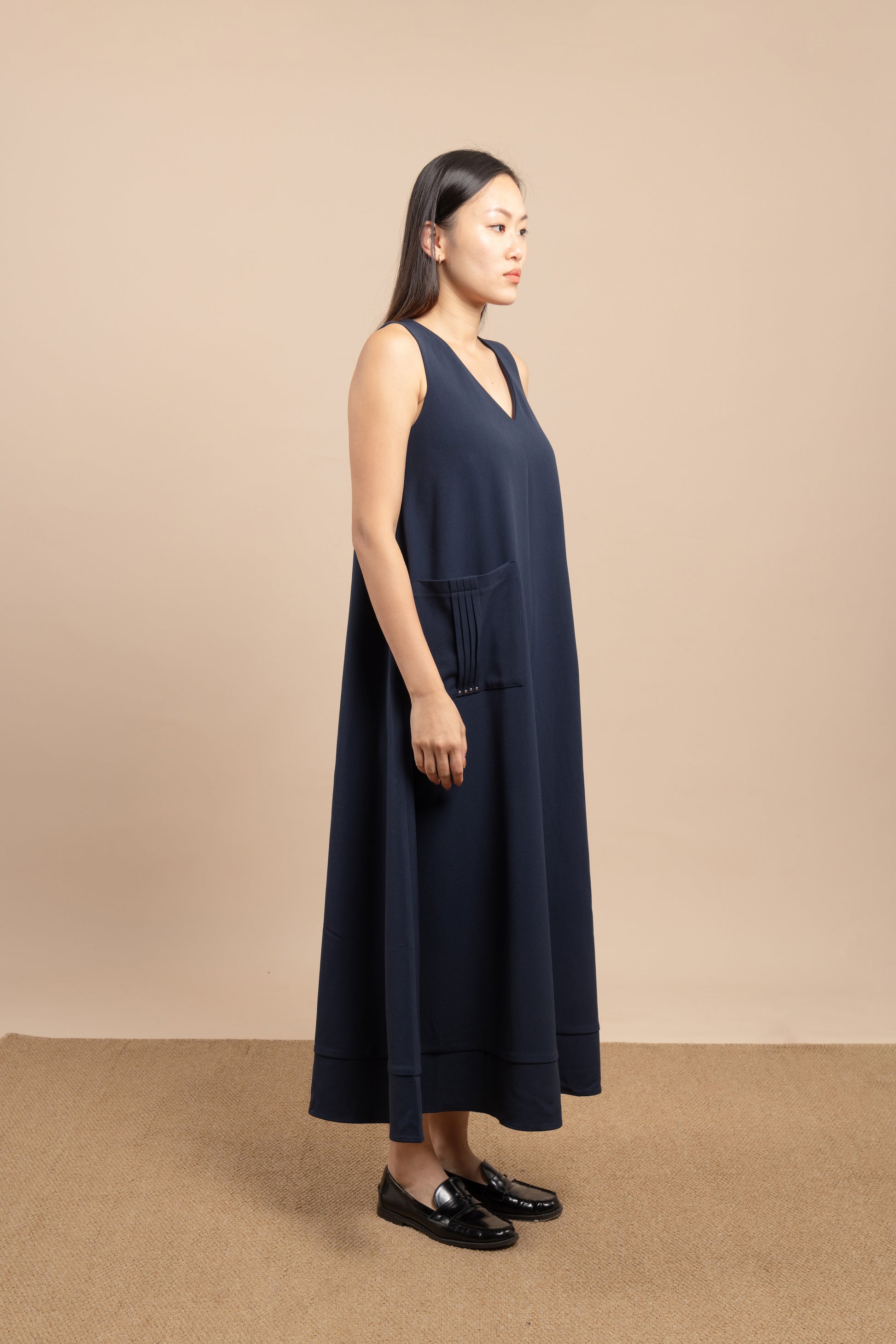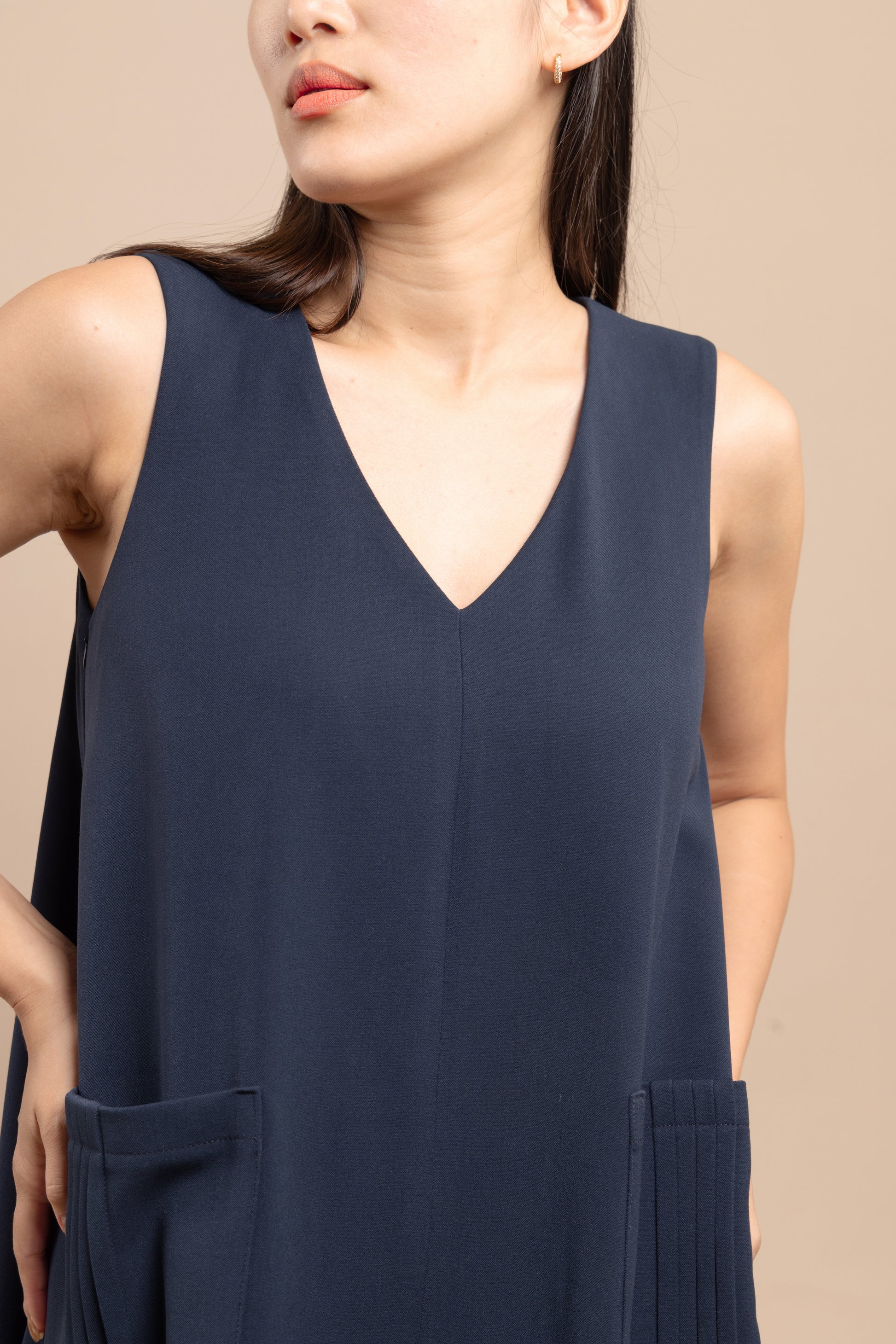 Sleeveless V-neck Midi A-Line Dress, featuring fine pleat details, smooth fabric, and a concealed zipper at the side waist.