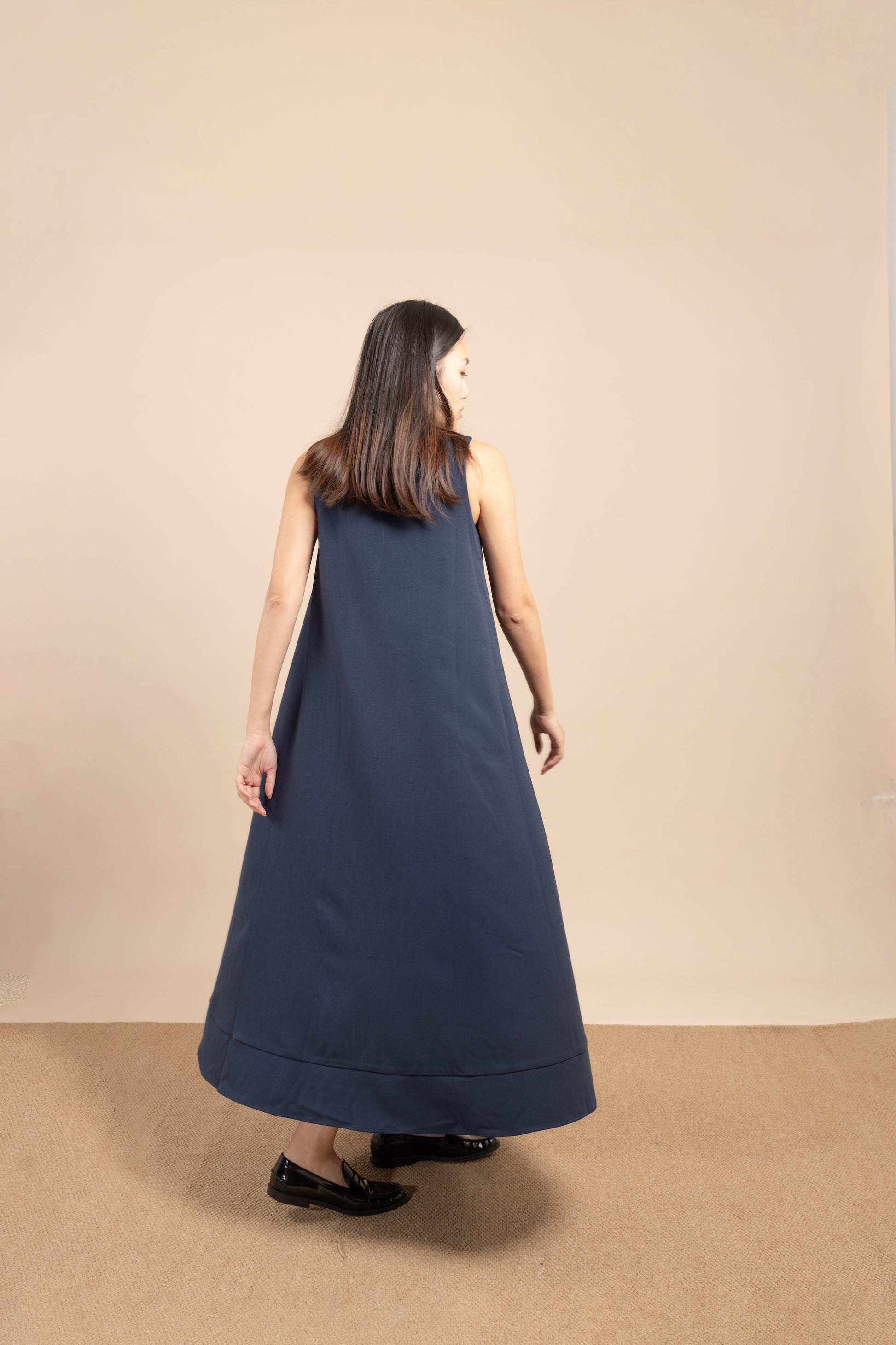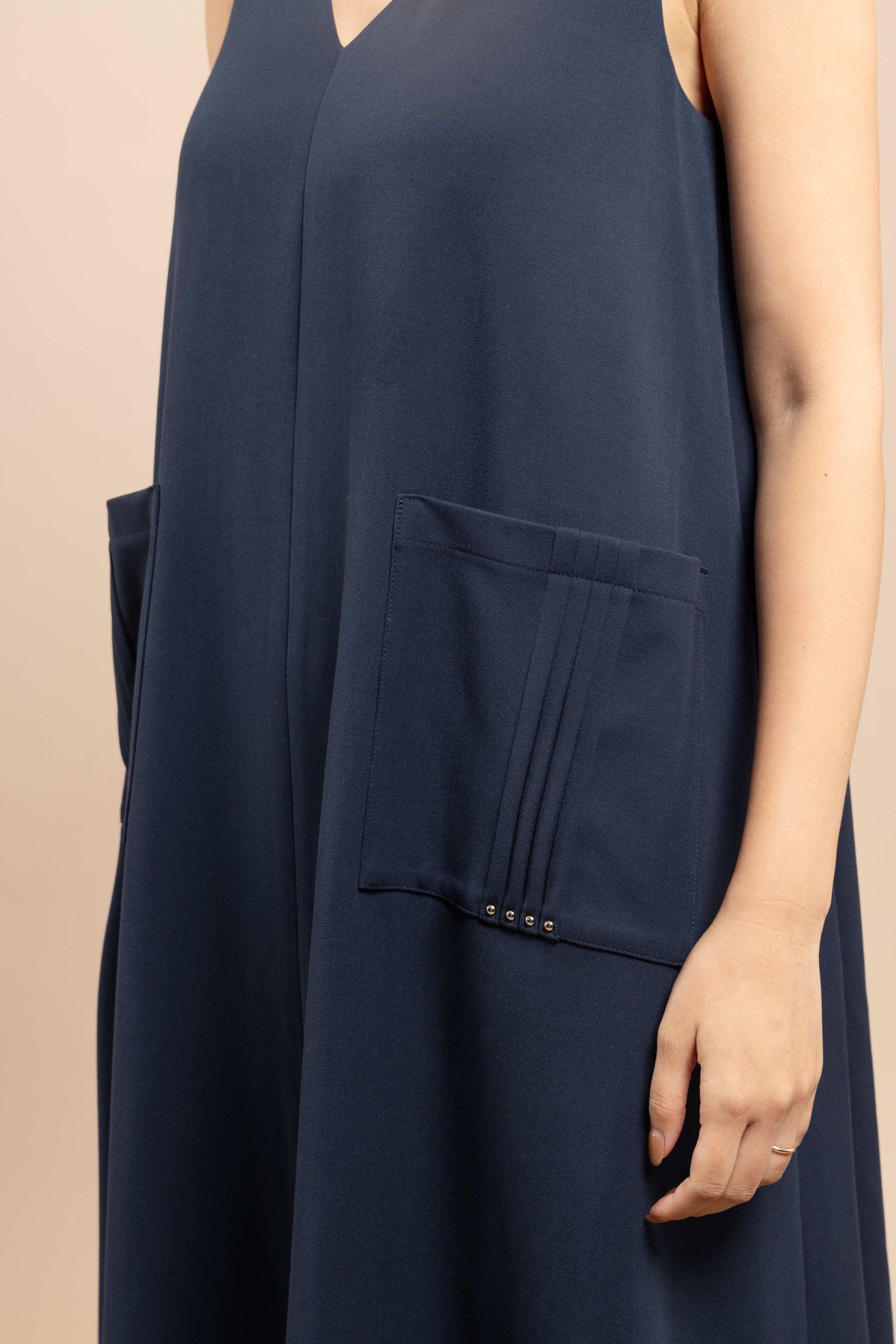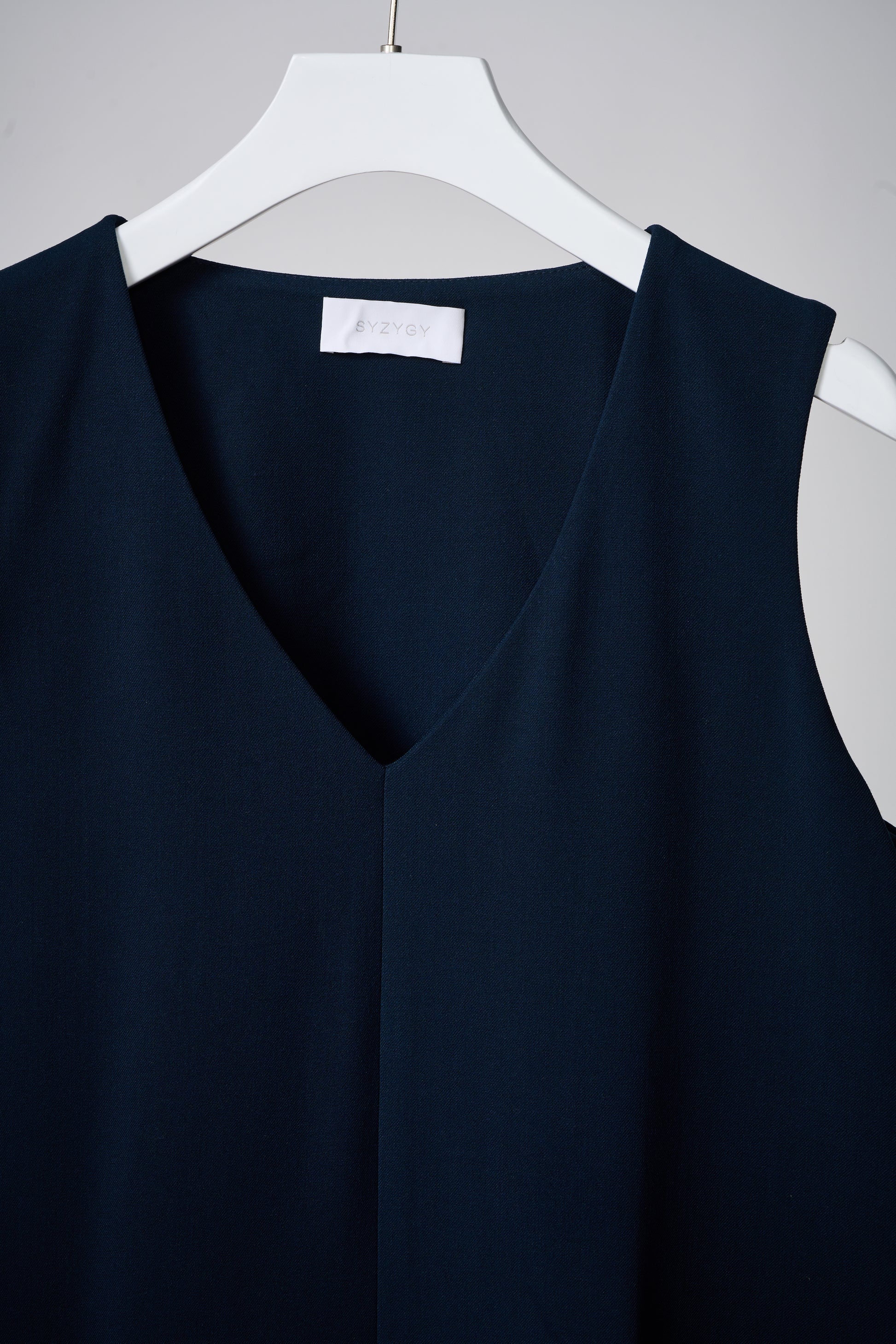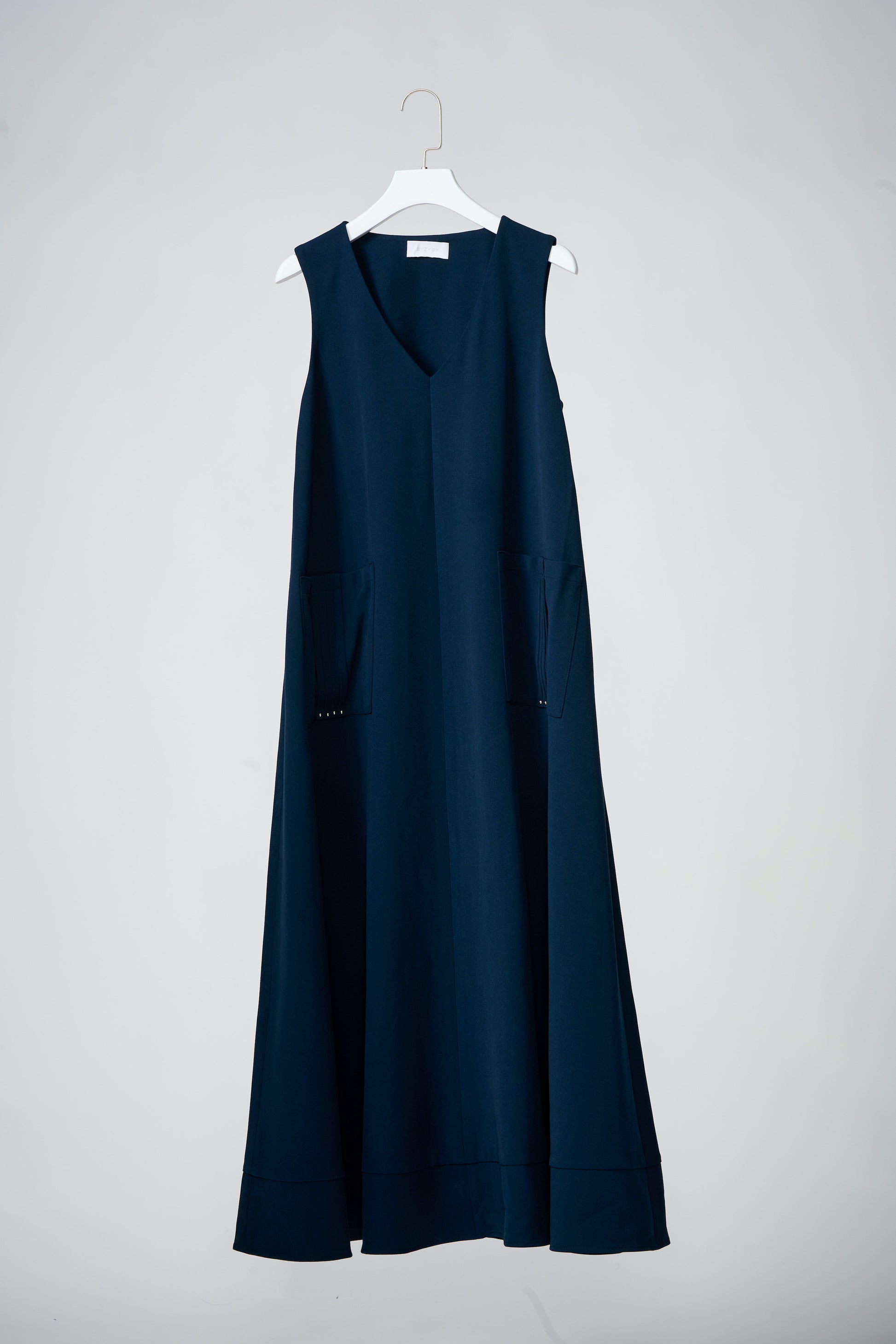 Sleeveless V-neck Midi A-Line Dress, featuring fine pleat details, smooth fabric, and a concealed zipper at the side waist.