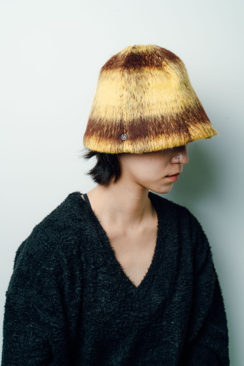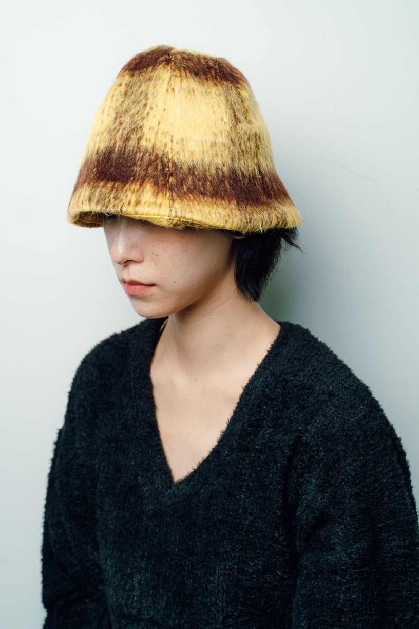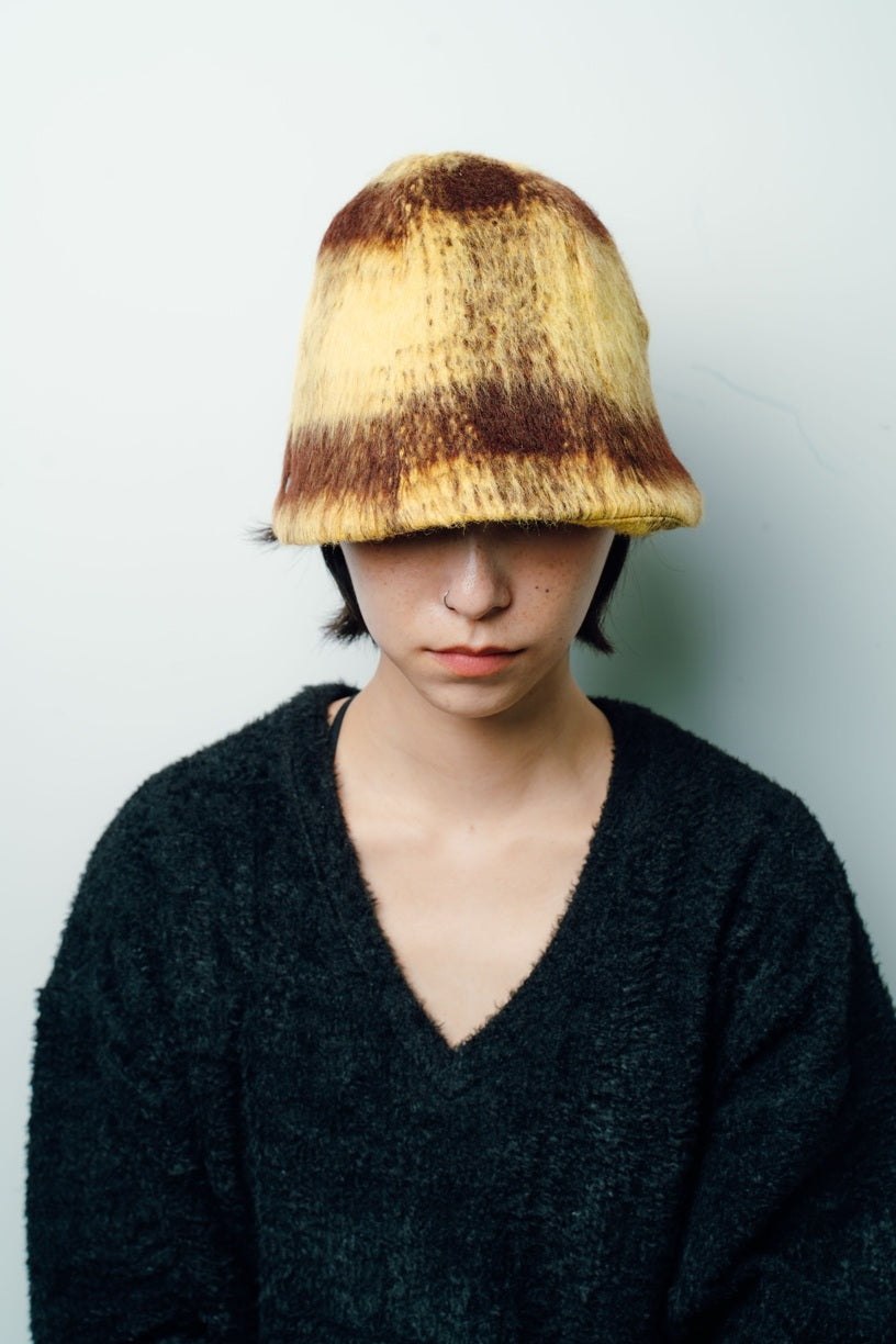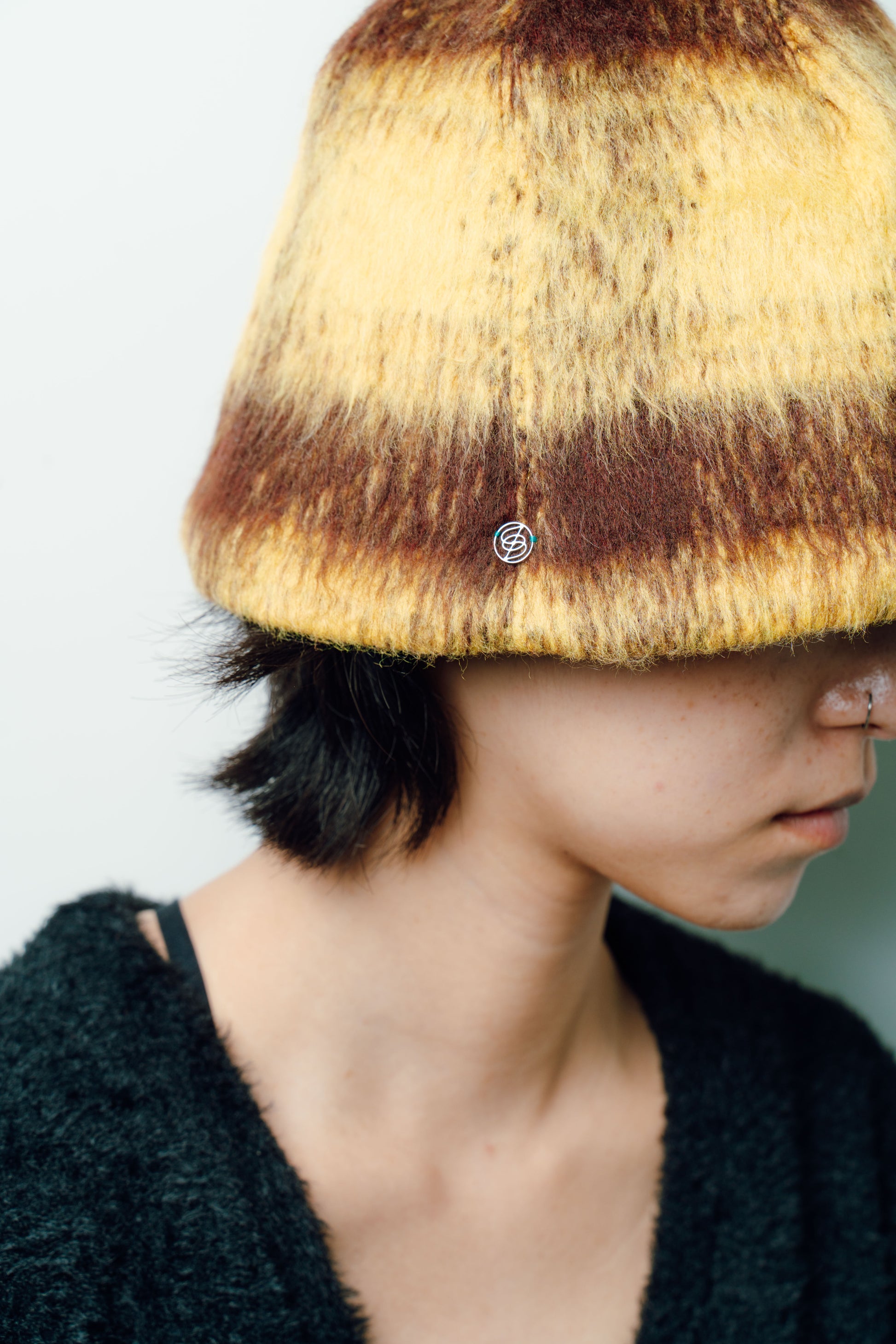 This bucket hat is an easy way to add texture to an outfit. it's knitted from a tactile mohair blend in a ribbed cardigan stitch and has an extended brim.