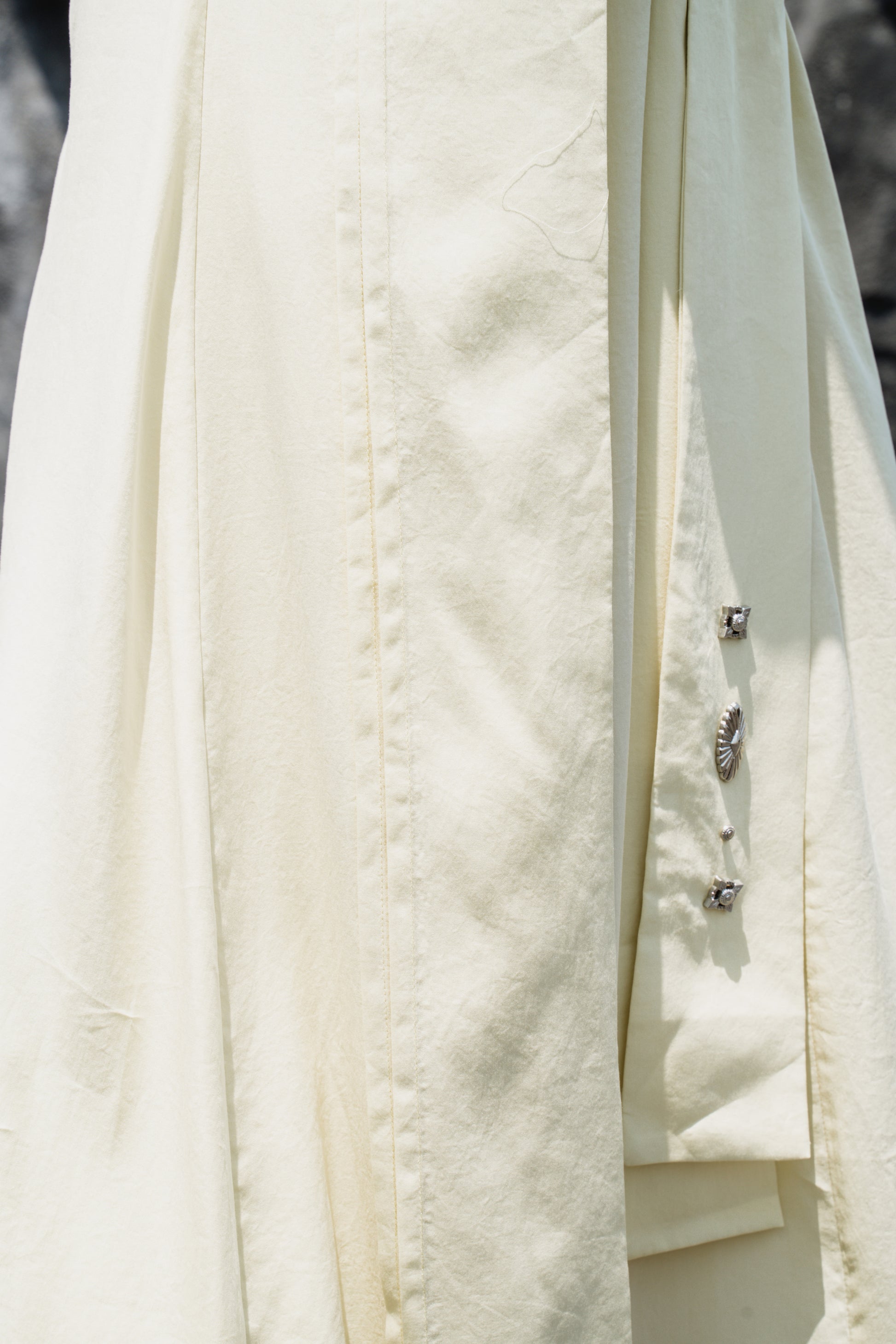 crafted with a silk-like sheen and smooth texture, offers exceptional comfort and elegance. Featuring intricate twisted detailing on the front, a versatile waist tie for a tailored fit, and reversible front-to-back wear, it blends artistry with practicality. Its radiant finish and fluid drape make it a versatile piece, perfect for both day and evening ensembles, pairing effortlessly with tailored flowing skirts for a sophisticated, modern look.